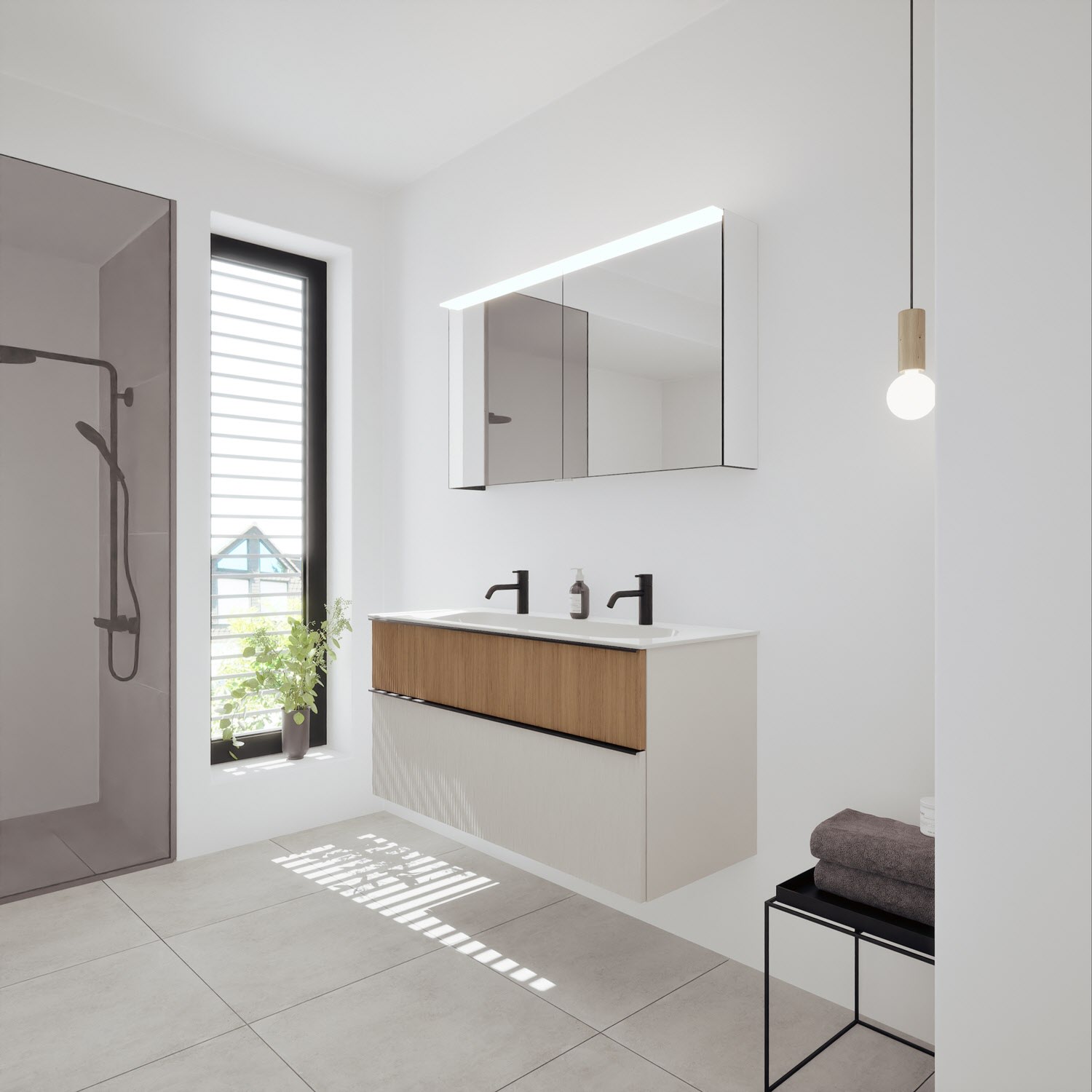 burgbad Fiumo 2.0 Spiegelschrank 120,6 cm mit LED-Aufsatzleuchte und Waschplatzbeleuchtung, 2 Spiegeltüren