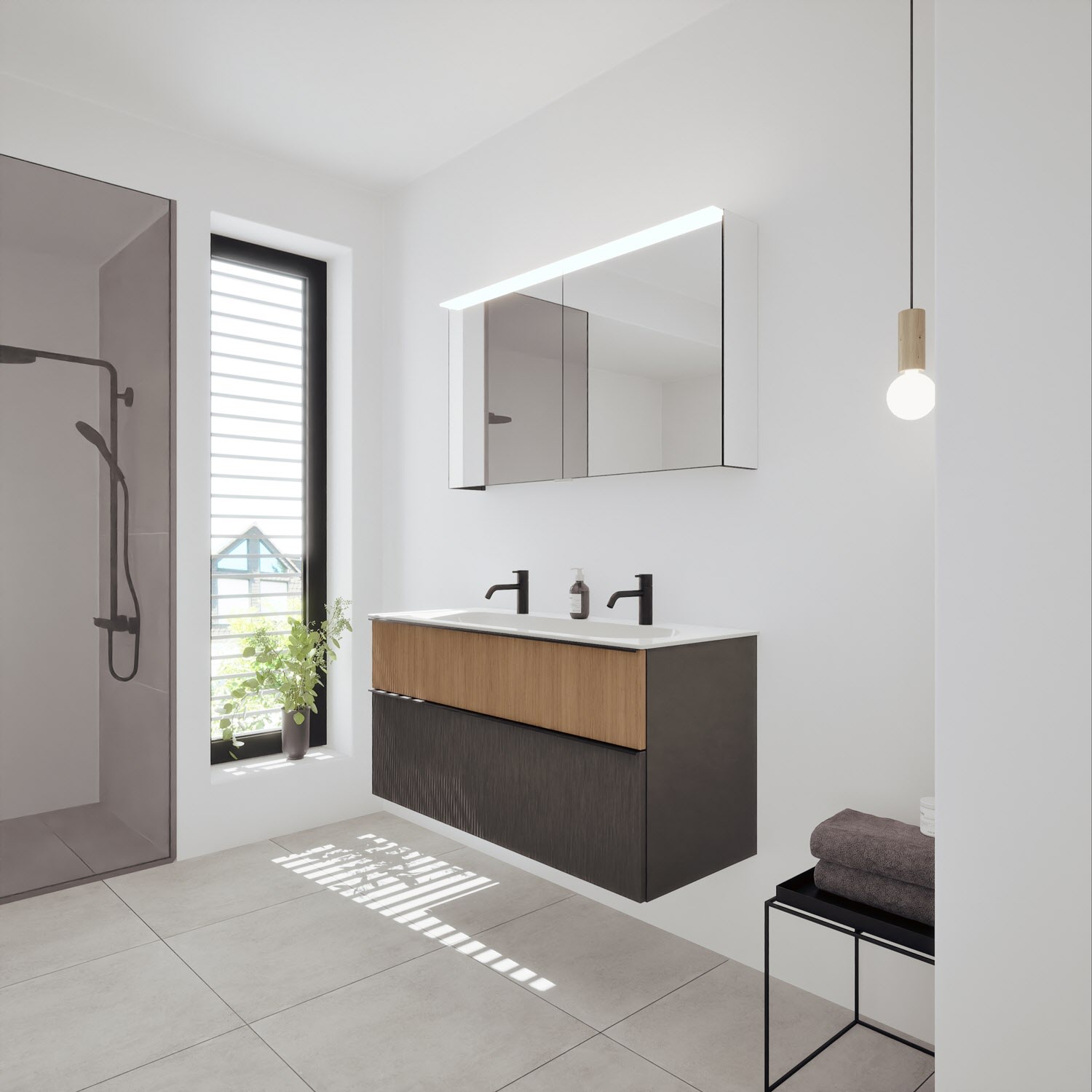 burgbad Fiumo 2.0 Spiegelschrank 120,6 cm mit LED-Aufsatzleuchte und Waschplatzbeleuchtung, 2 Spiegeltüren