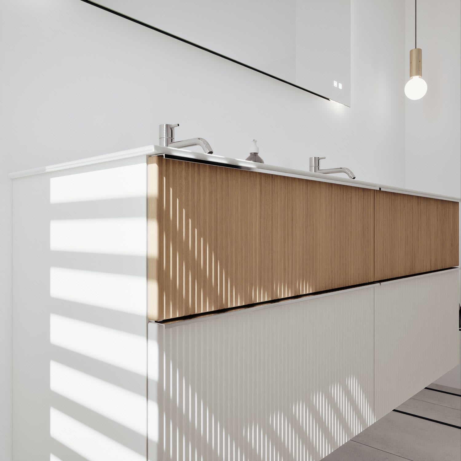 - 2 Schubladen oben, 35 cm tief, mit vertikaler Struktur inkl. mit Siphonausschnitt und Inneneinteilung