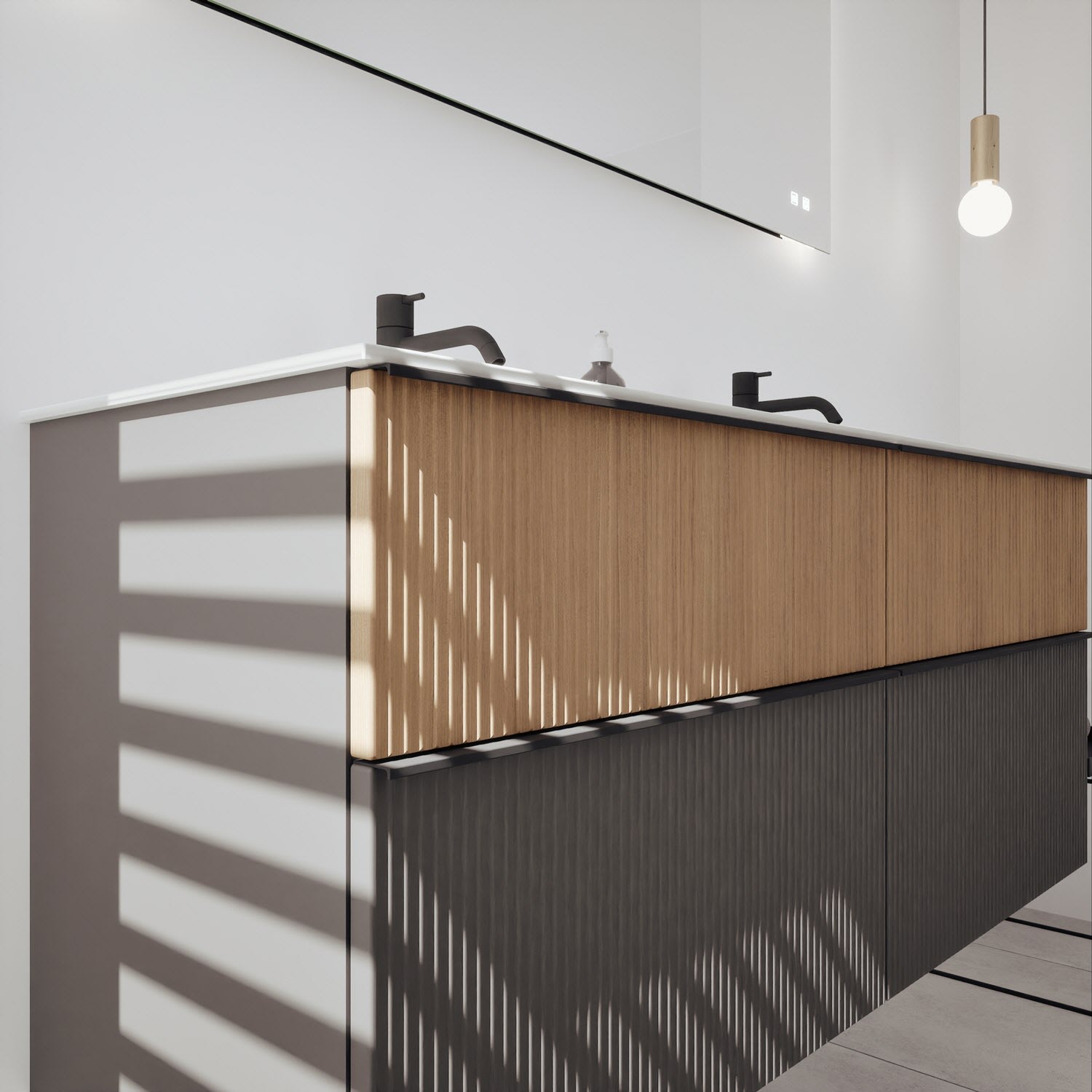 - 2 Schubladen oben, 35 cm tief, mit vertikaler Struktur inkl. mit Siphonausschnitt und Inneneinteilung
