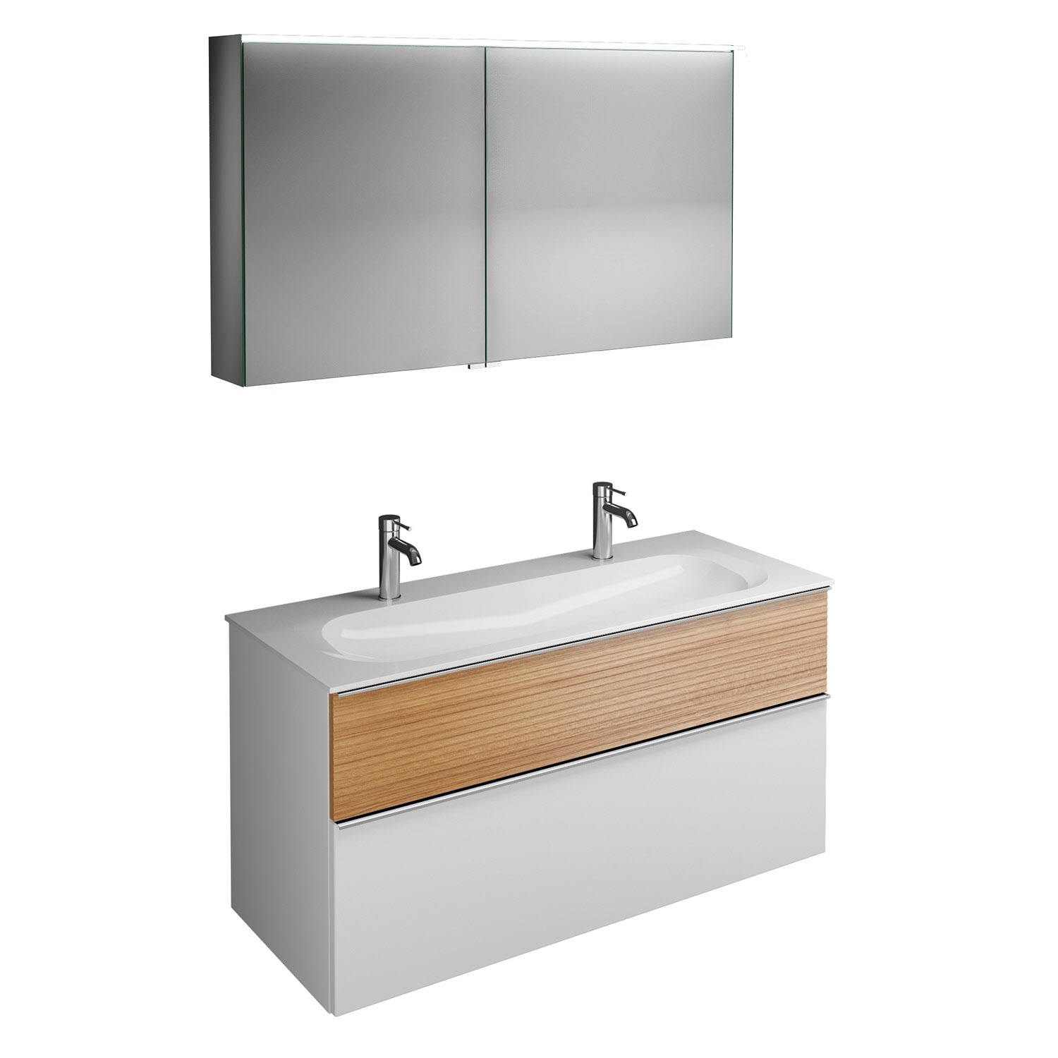 burgbad Fiumo Badmöbel-Set 122 cm mit Waschtisch mit 2 Hahnlöcher und Unterschrank mit Griff G0146 sowie mit Spiegelschrank