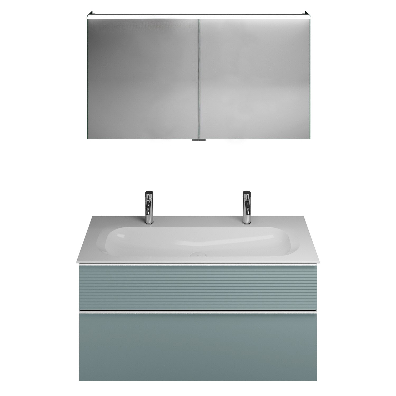 burgbad Fiumo Badmöbel-Set 122 cm mit Waschtisch mit 2 Hahnlöcher und Unterschrank mit Griff G0146 sowie mit Spiegelschrank