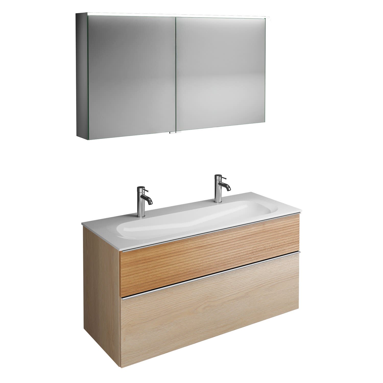 burgbad Fiumo Badmöbel-Set 122 cm mit Waschtisch mit 2 Hahnlöcher und Unterschrank mit Griff G0146 sowie mit Spiegelschrank
