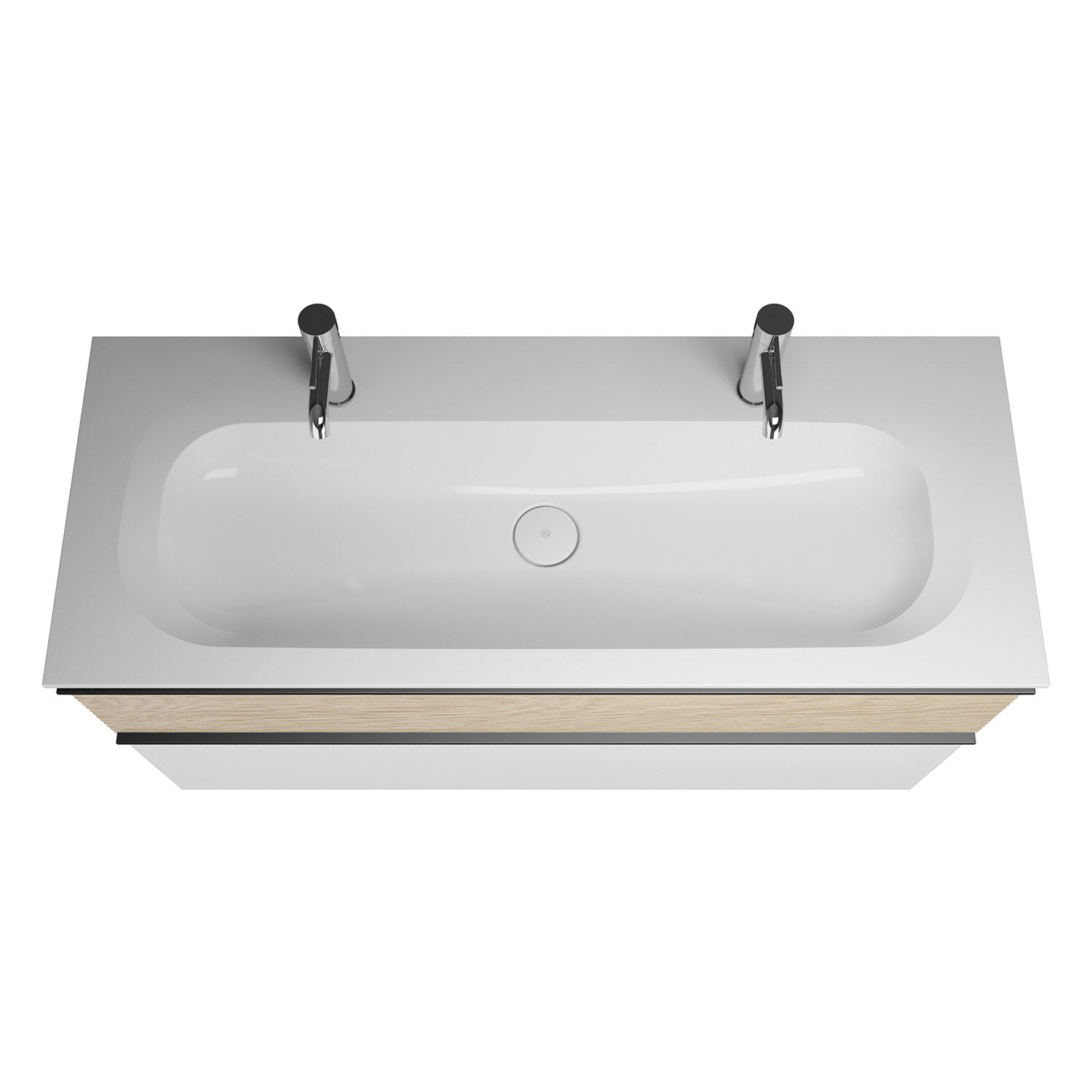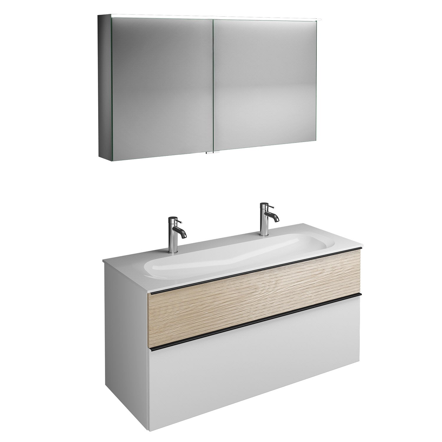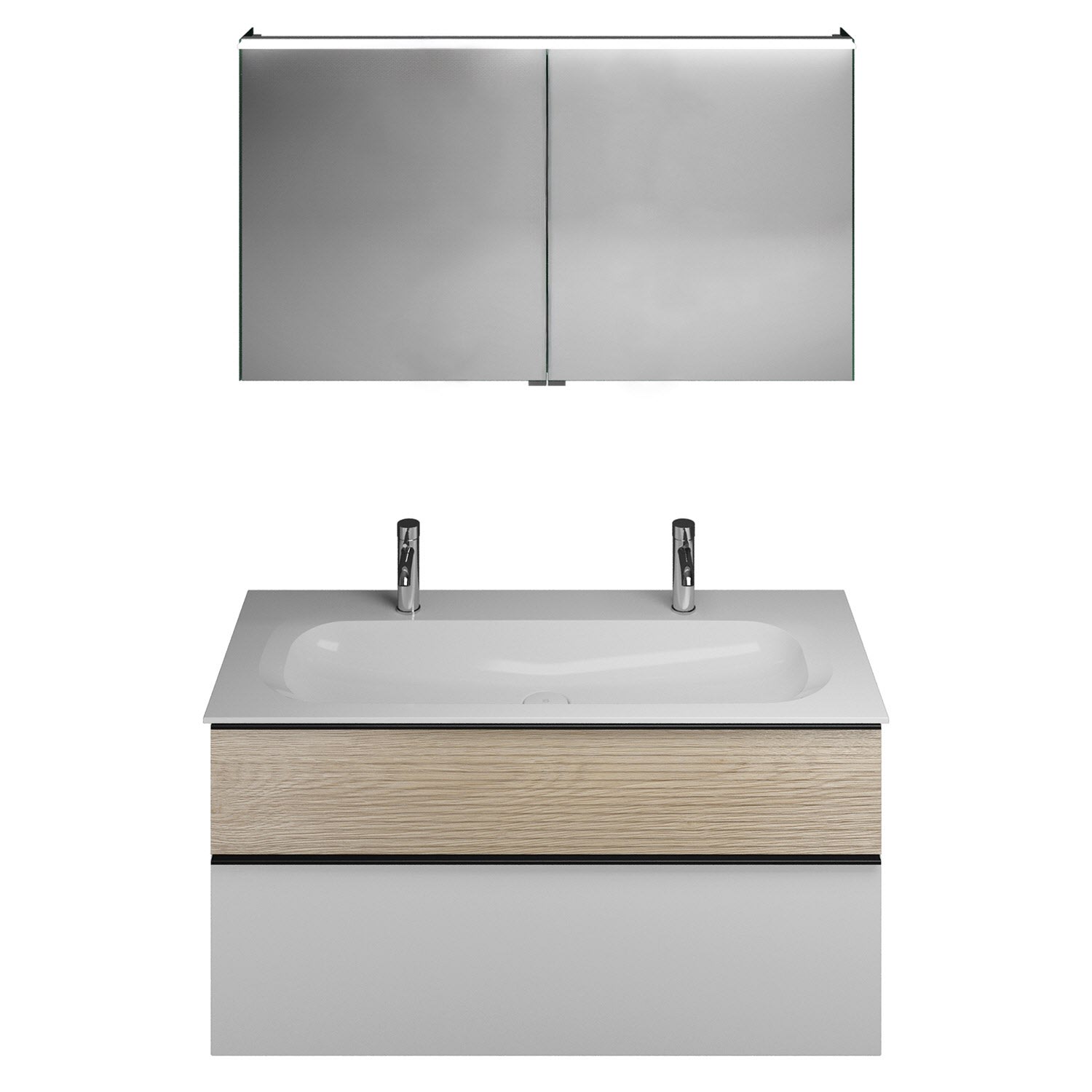 burgbad Fiumo Badmöbel-Set 122 cm mit Waschtisch mit 2 Hahnlöcher und Unterschrank mit Griff G0200 sowie mit Spiegelschrank