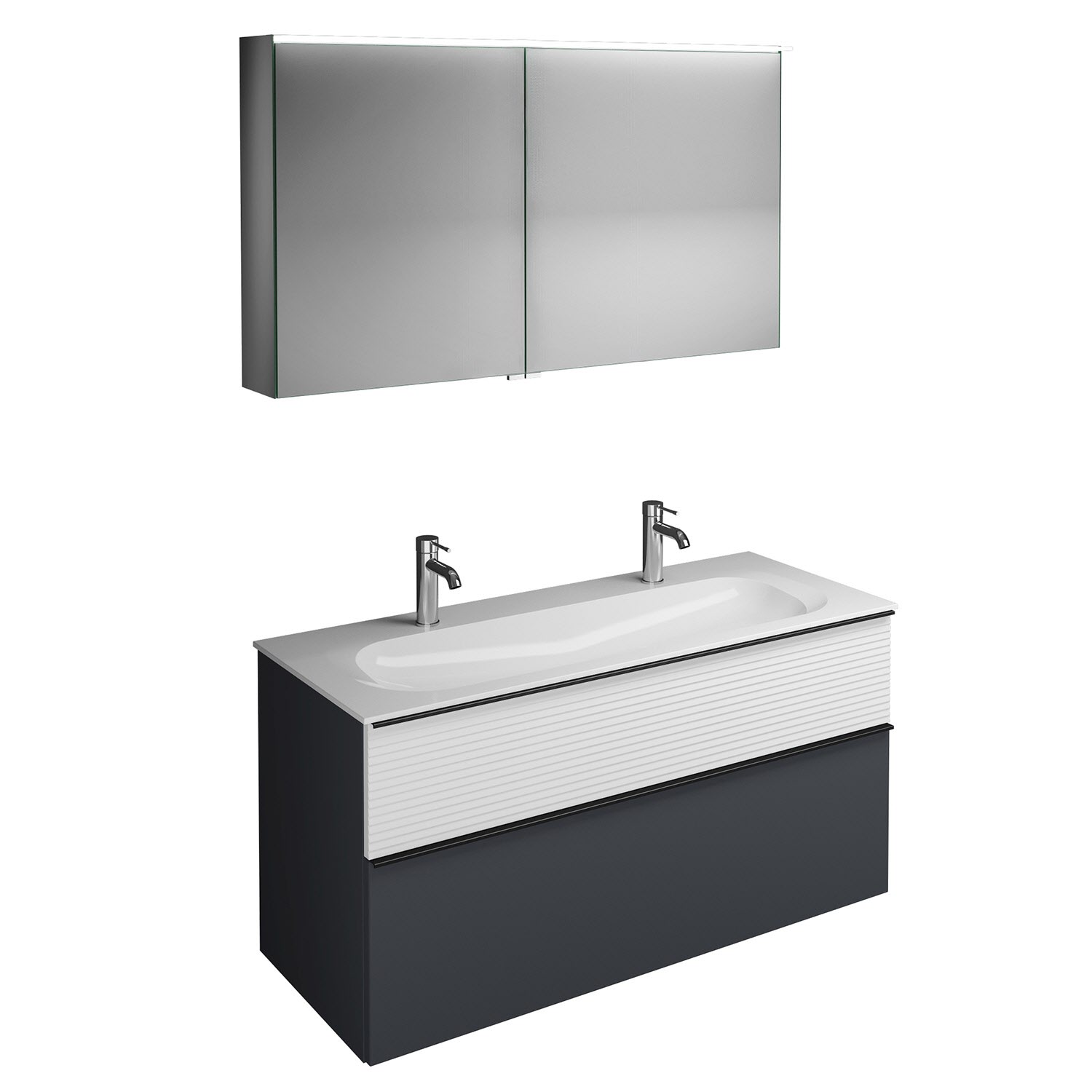 burgbad Fiumo Badmöbel-Set 122 cm mit Waschtisch mit 2 Hahnlöcher und Unterschrank mit Griff G0200 sowie mit Spiegelschrank
