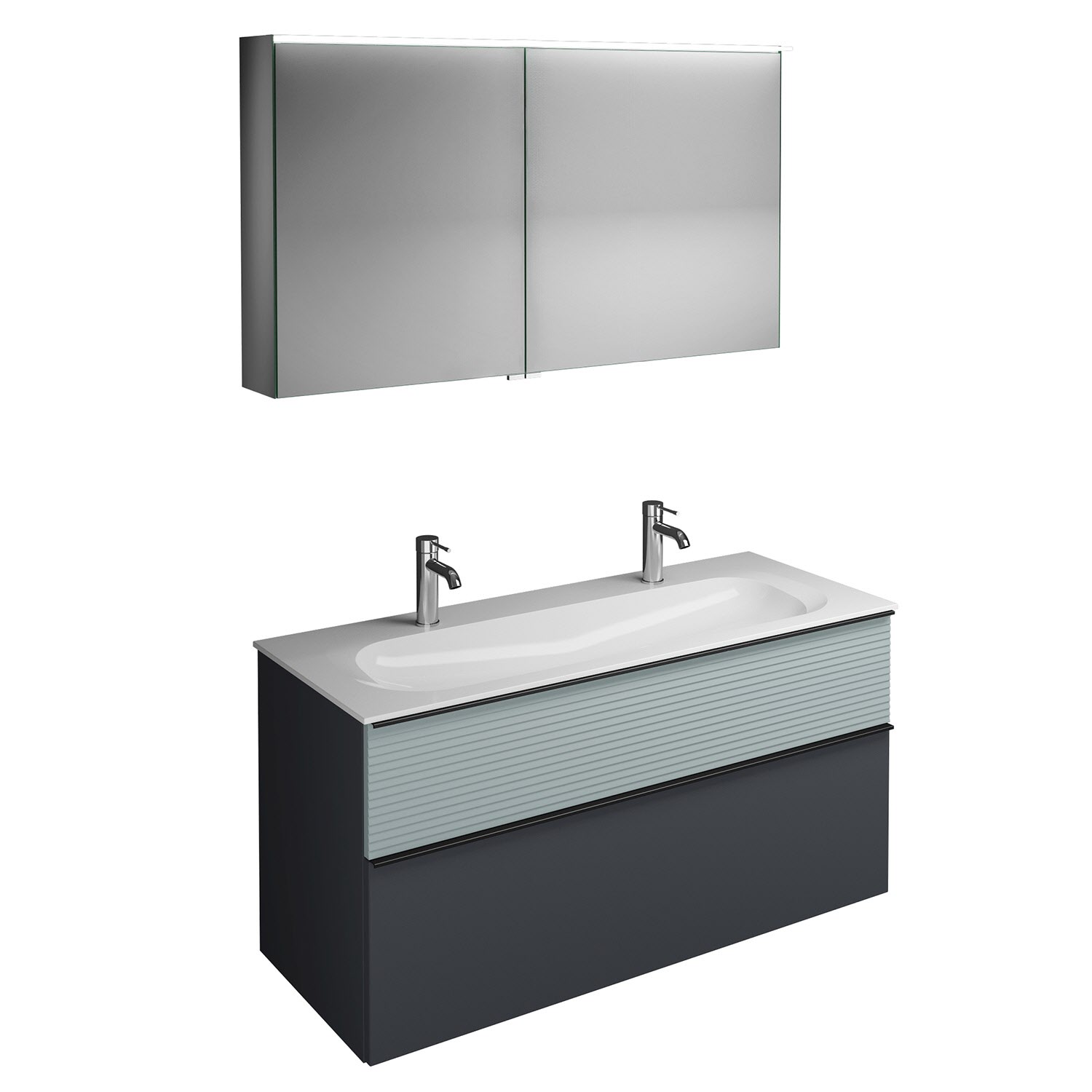 burgbad Fiumo Badmöbel-Set 122 cm mit Waschtisch mit 2 Hahnlöcher und Unterschrank mit Griff G0200 sowie mit Spiegelschrank
