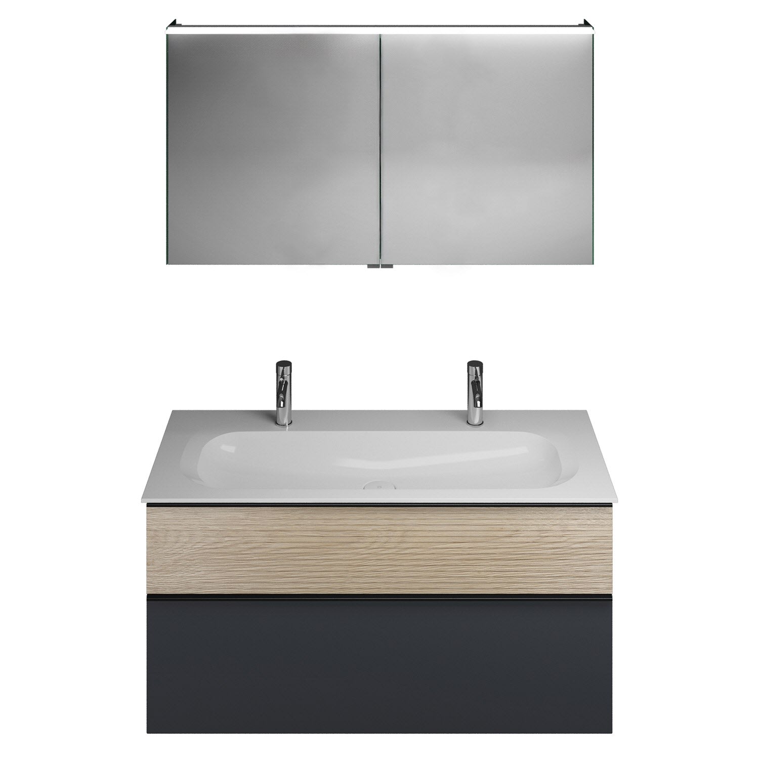 burgbad Fiumo Badmöbel-Set 122 cm mit Waschtisch mit 2 Hahnlöcher und Unterschrank mit Griff G0200 sowie mit Spiegelschrank