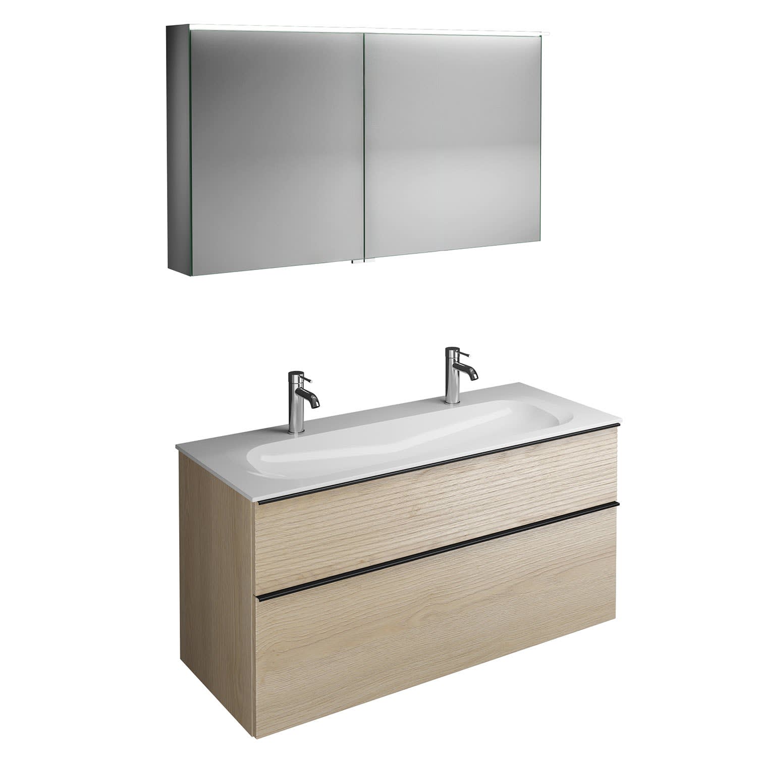 burgbad Fiumo Badmöbel-Set 122 cm mit Waschtisch mit 2 Hahnlöcher und Unterschrank mit Griff G0200 sowie mit Spiegelschrank