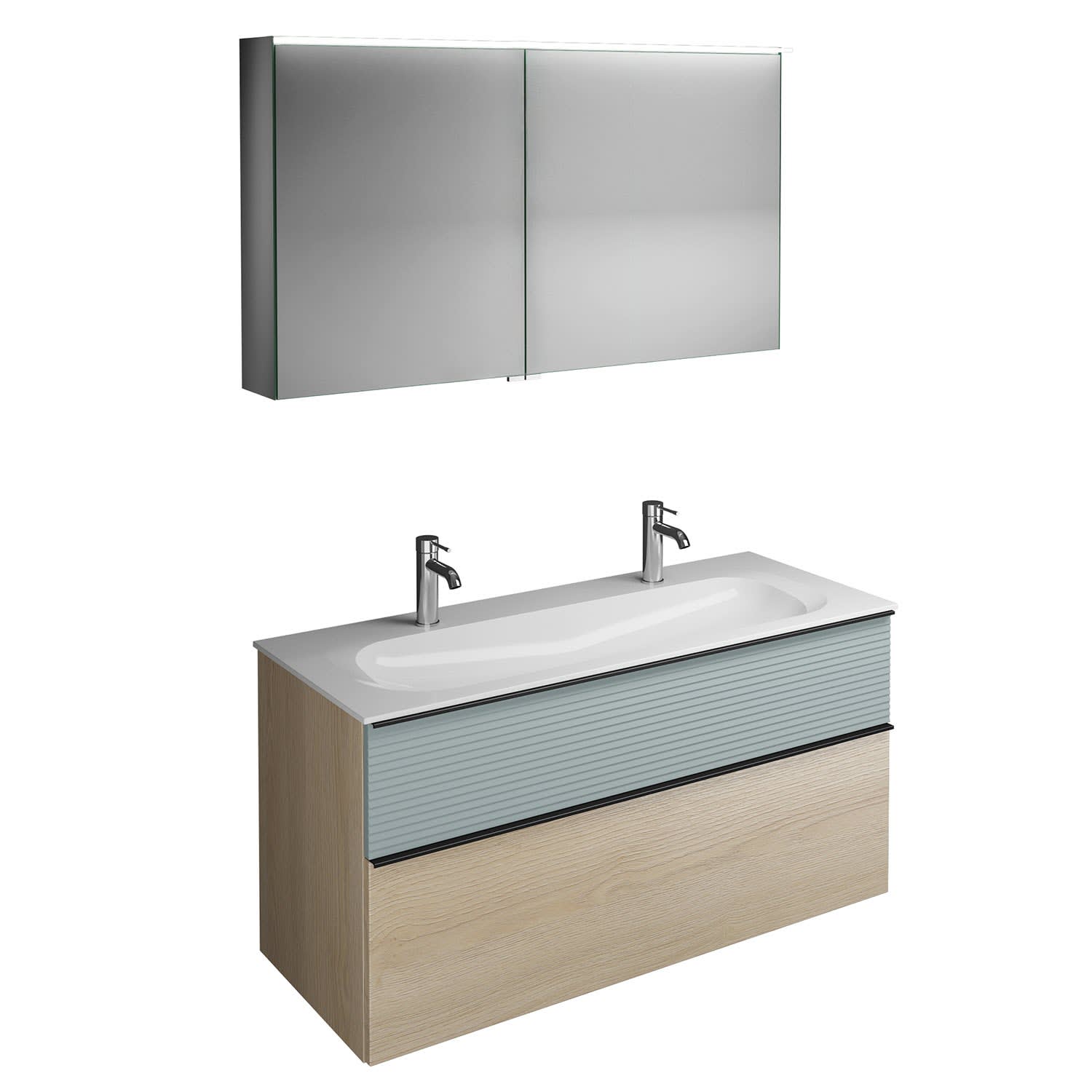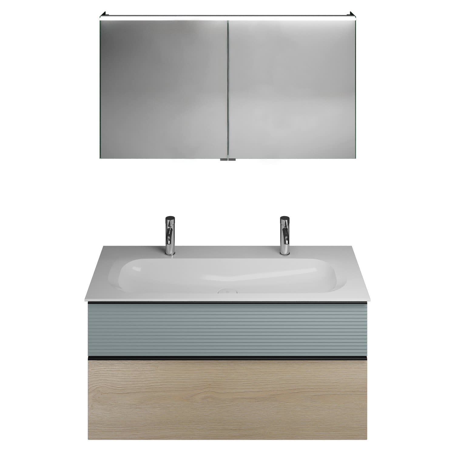 burgbad Fiumo Badmöbel-Set 122 cm mit Waschtisch mit 2 Hahnlöcher und Unterschrank mit Griff G0200 sowie mit Spiegelschrank