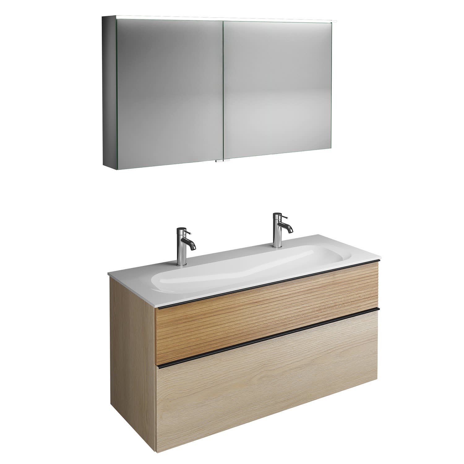 burgbad Fiumo Badmöbel-Set 122 cm mit Waschtisch mit 2 Hahnlöcher und Unterschrank mit Griff G0200 sowie mit Spiegelschrank