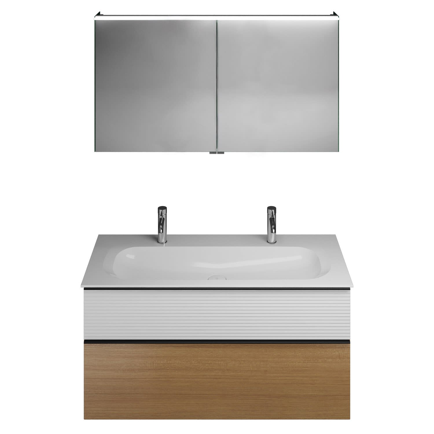 burgbad Fiumo Badmöbel-Set 122 cm mit Waschtisch mit 2 Hahnlöcher und Unterschrank mit Griff G0200 sowie mit Spiegelschrank