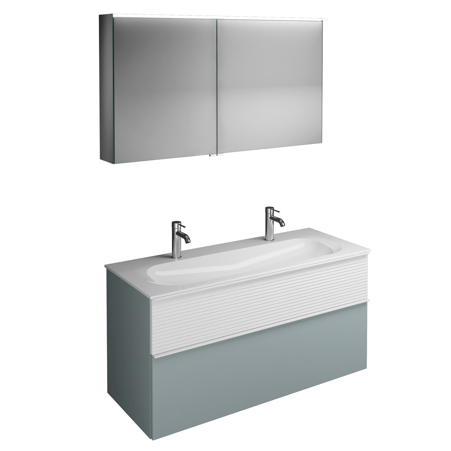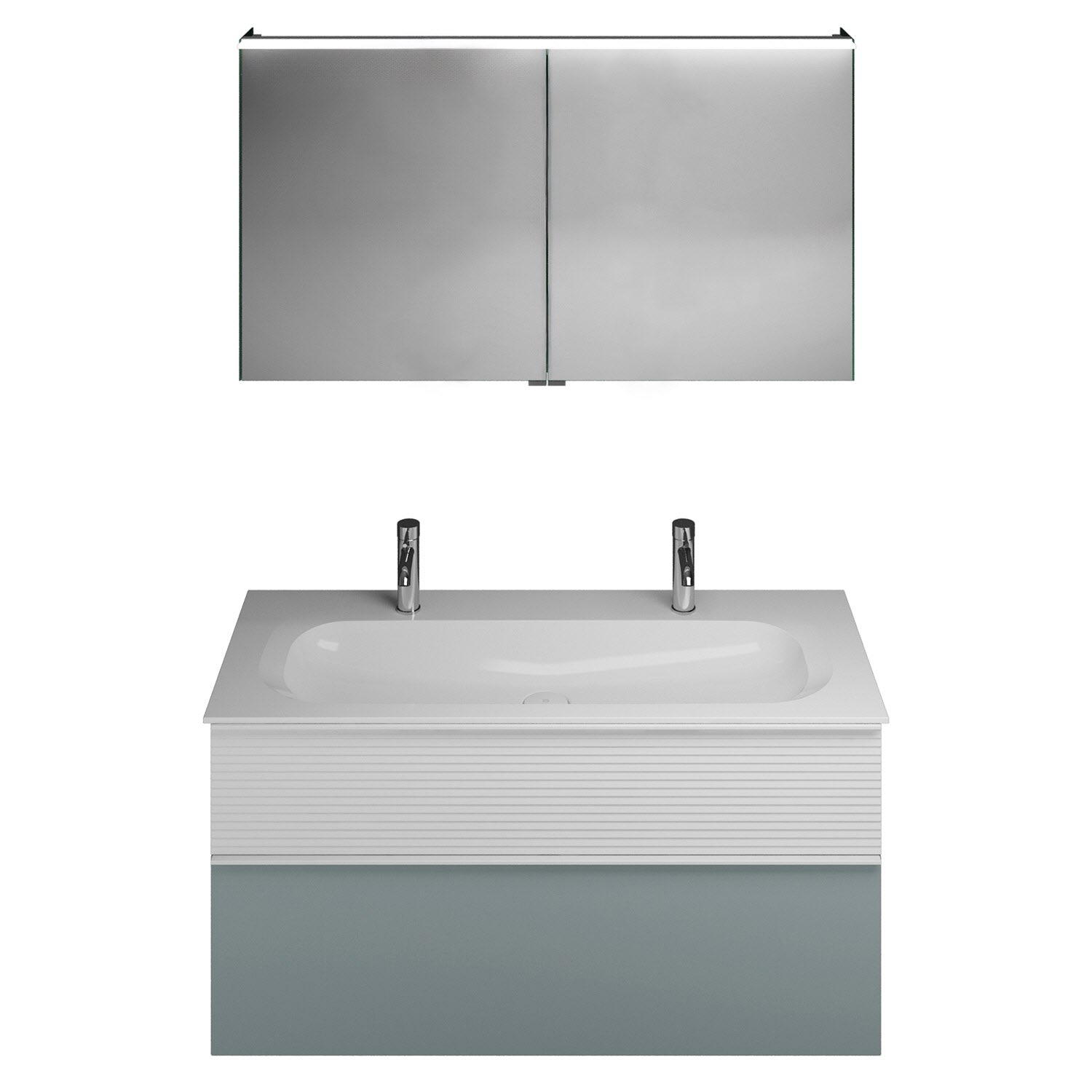 burgbad Fiumo Badmöbel-Set 122 cm mit Waschtisch mit 2 Hahnlöcher und Unterschrank mit Griff G0223 sowie mit Spiegelschrank