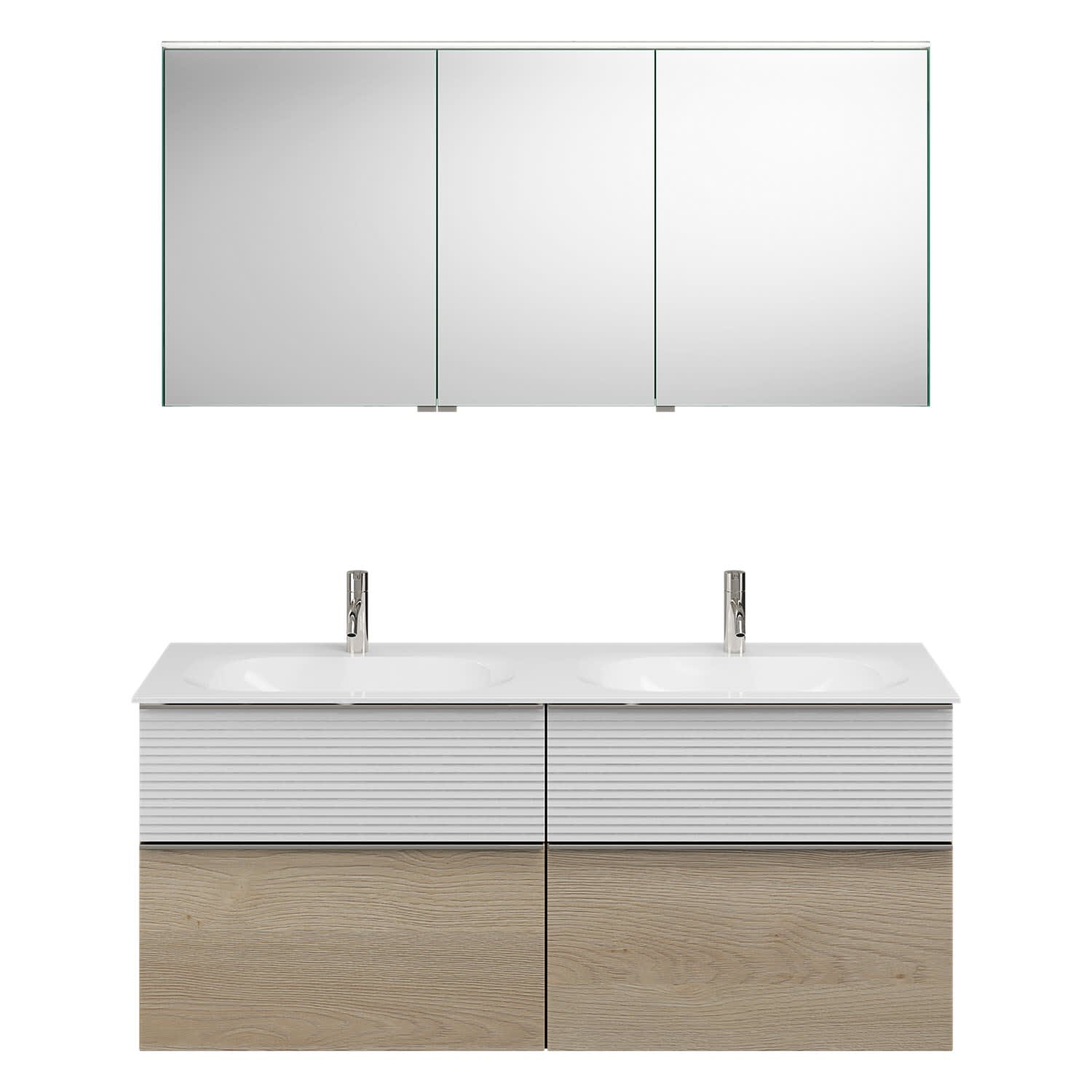 burgbad Fiumo Badmöbel-Set 142 cm mit Doppel-Waschtisch und Unterschrank mit Griff G0146 sowie mit Spiegelschrank