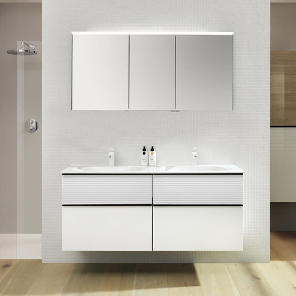burgbad Fiumo Badmöbel-Set 142 cm mit Doppel-Waschtisch und Unterschrank mit Griff G0200 sowie mit Spiegelschrank