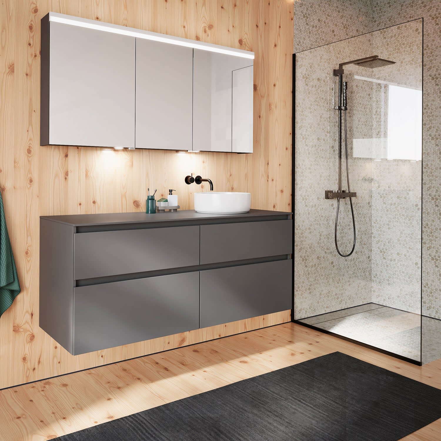 burgbad Lin20 Spiegelschrank mit LED-Beleuchtung, 140 cm, 3 Spiegeltüren, rechts, mit Waschtischbeleuchtung