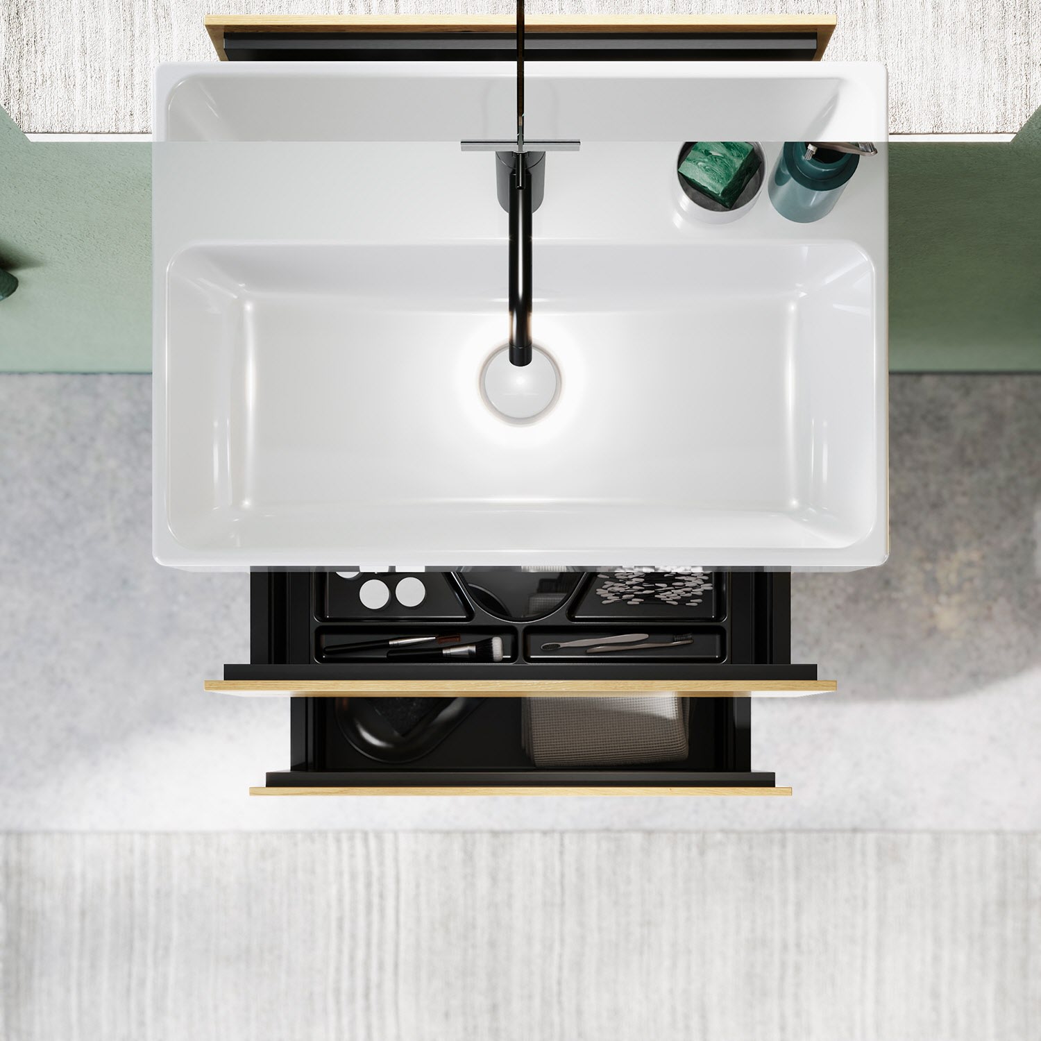 - 1 Auszug oben H: 22 T: 26 cm, mit Siphonausschnitt und Inneneinteilung