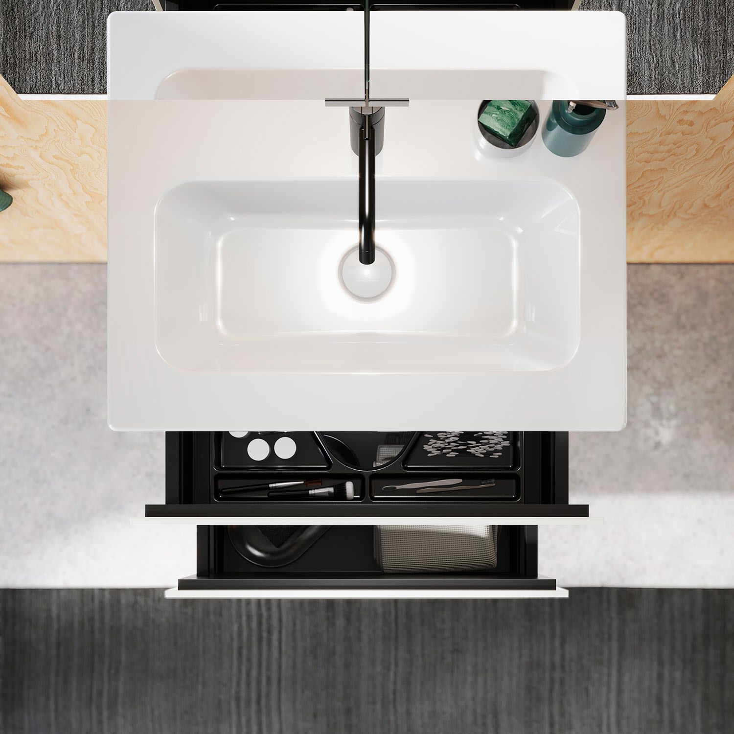 - 1 Auszug oben H: 22 T: 26 cm, mit Siphonausschnitt und Inneneinteilung