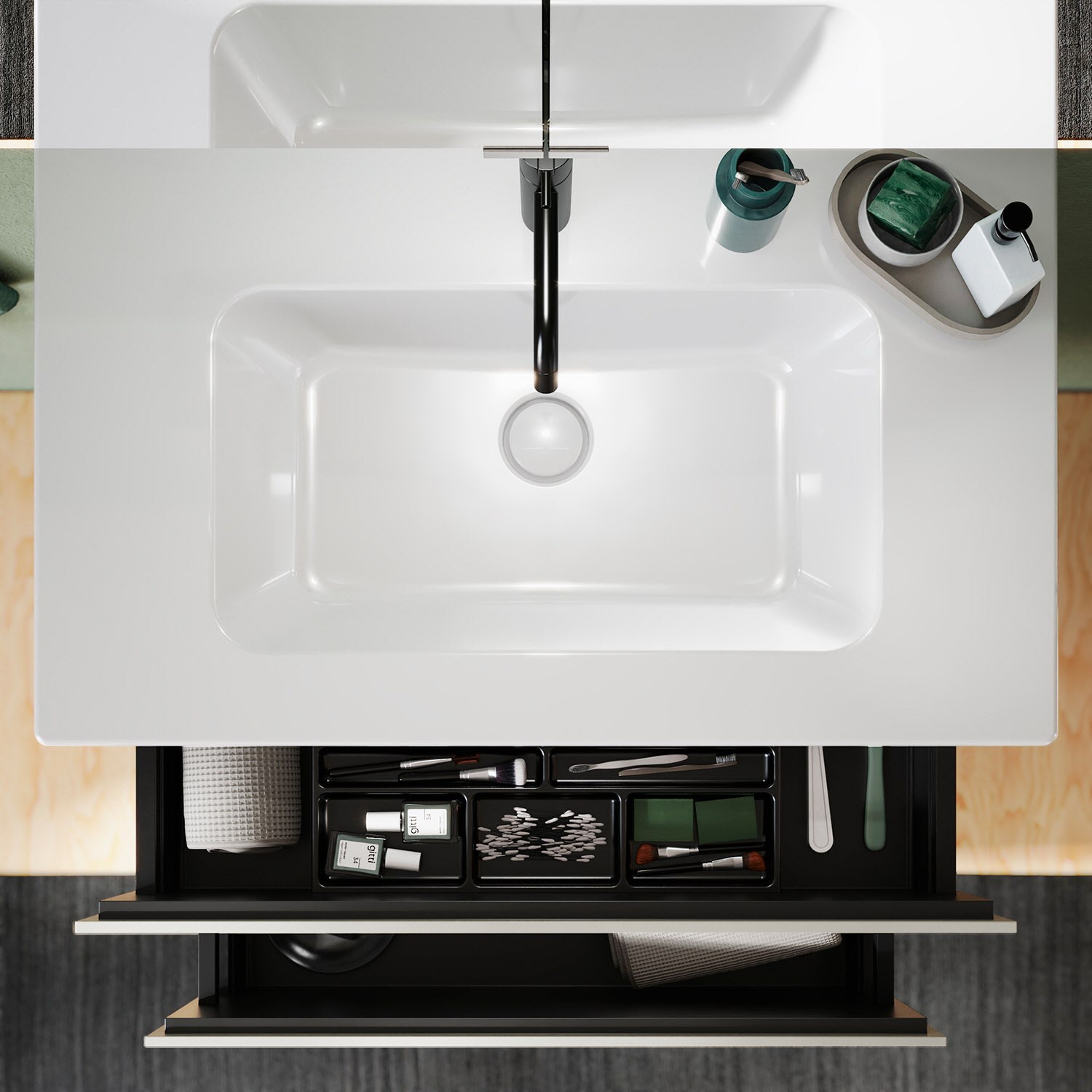 - 1 Auszug oben H: 22 T: 35 cm, mit Siphonausschnitt und Inneneinteilung