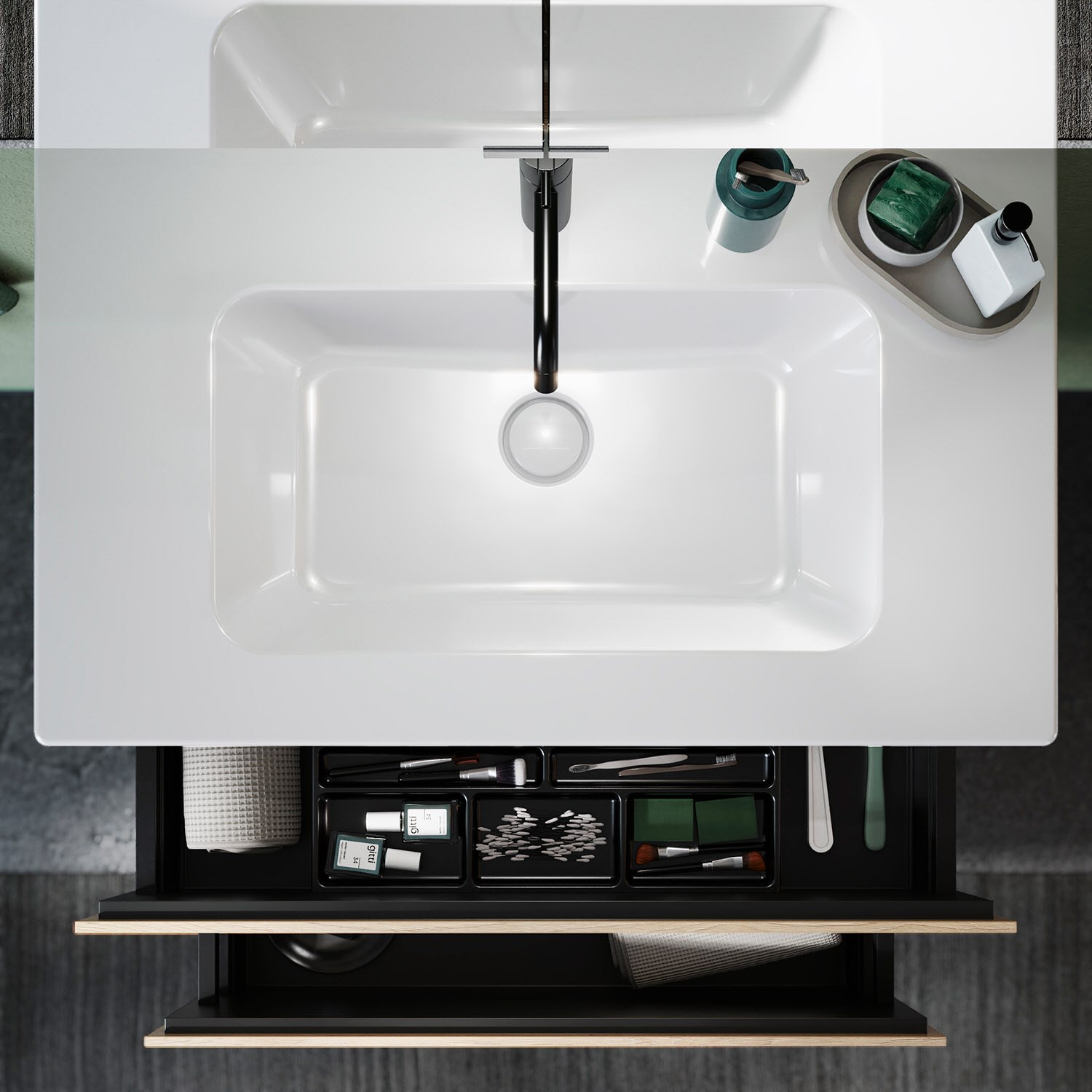 - 1 Auszug oben H: 22 T: 35 cm, mit Siphonausschnitt und Inneneinteilung