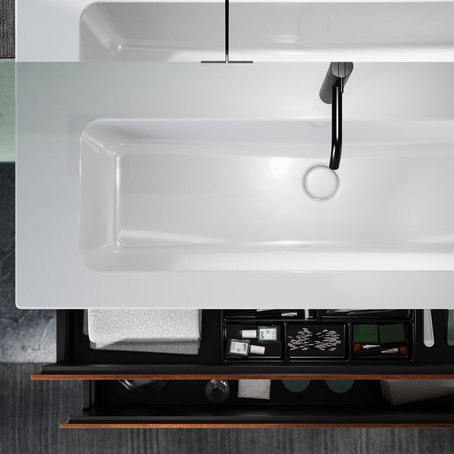 - 1 Auszug oben H: 22 T: 35 cm, mit Siphonausschnitt und Inneneinteilung