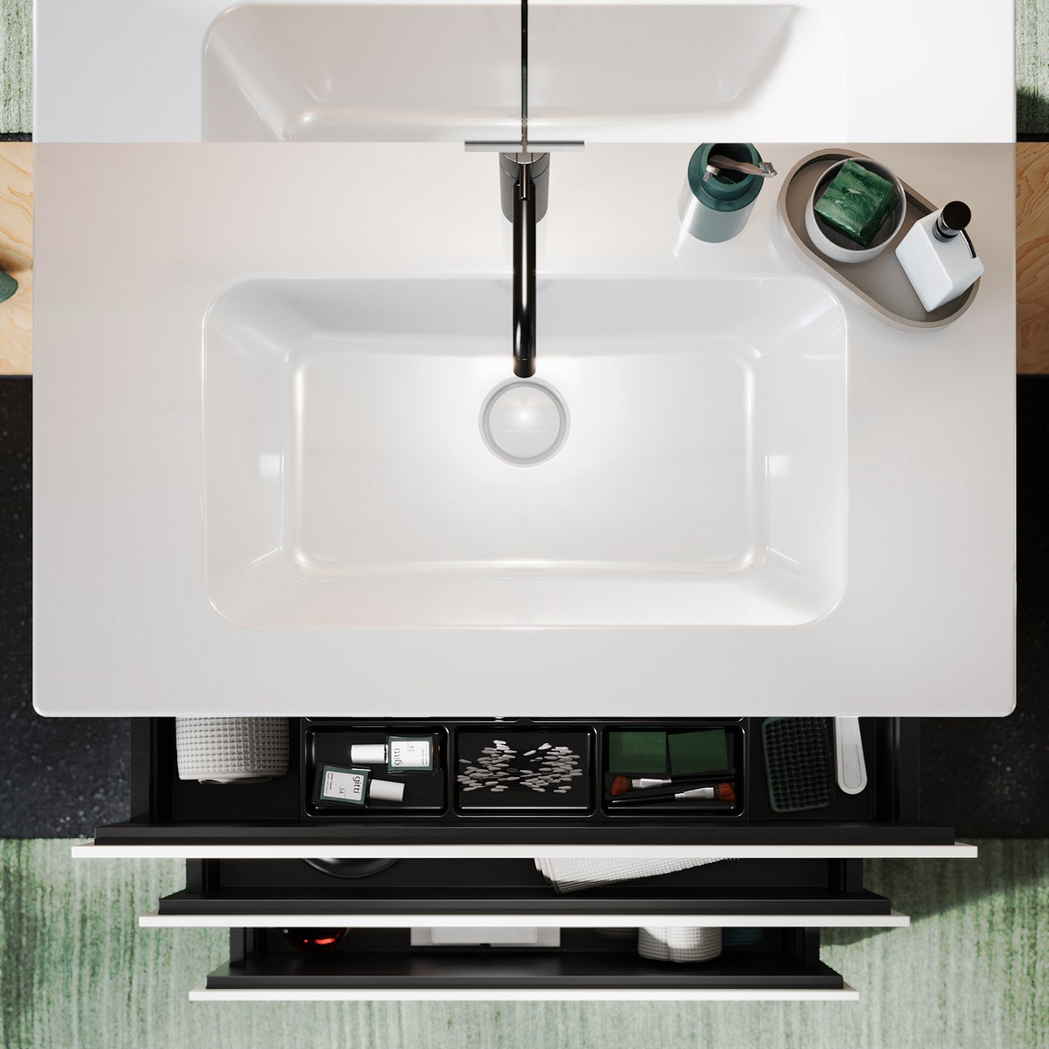 - 1 Auszug oben H: 22 T: 35 cm, mit Siphonausschnitt und Inneneinteilung