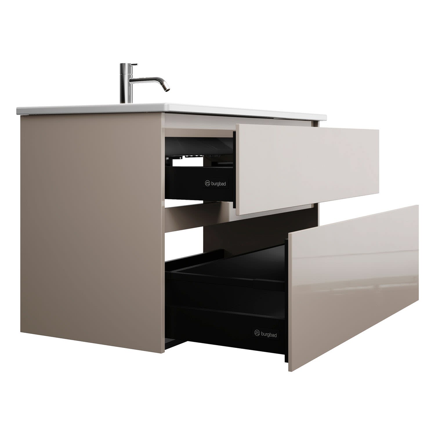 - Vollauszüge mit geräuscharmem Selbsteinzugsmechanismus und Anschlagdämpfung (Silent System)