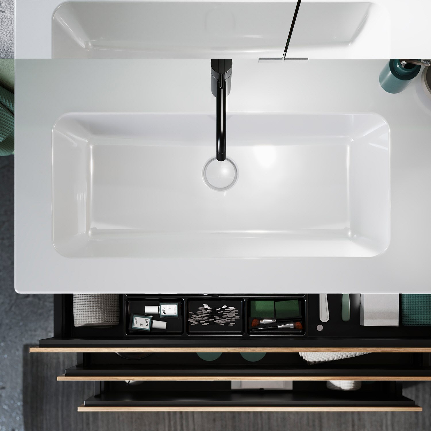 - 1 Auszug oben H: 22 T: 35 cm, mit Siphonausschnitt und Inneneinteilung