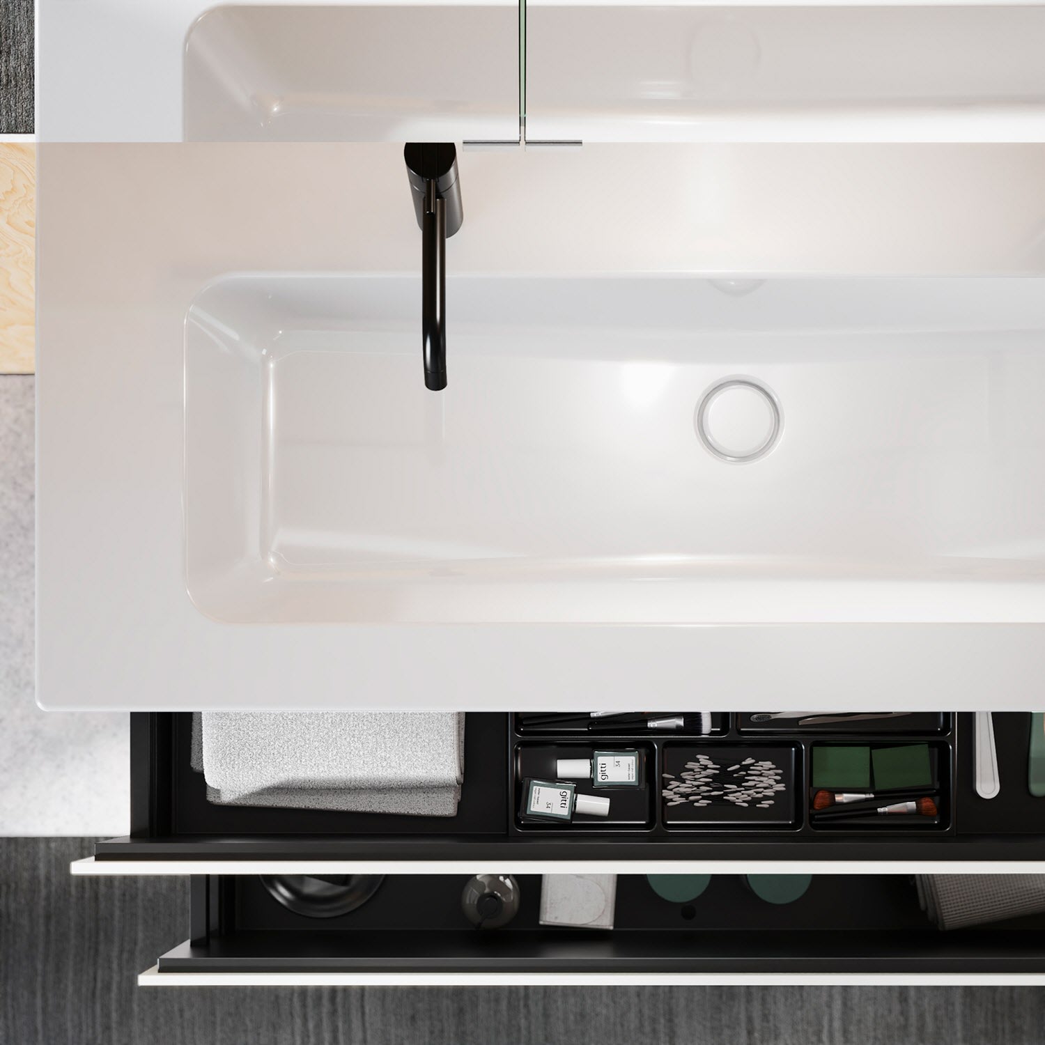 - 1 Auszug oben H: 22 T: 35 cm, mit Siphonausschnitt und Inneneinteilung