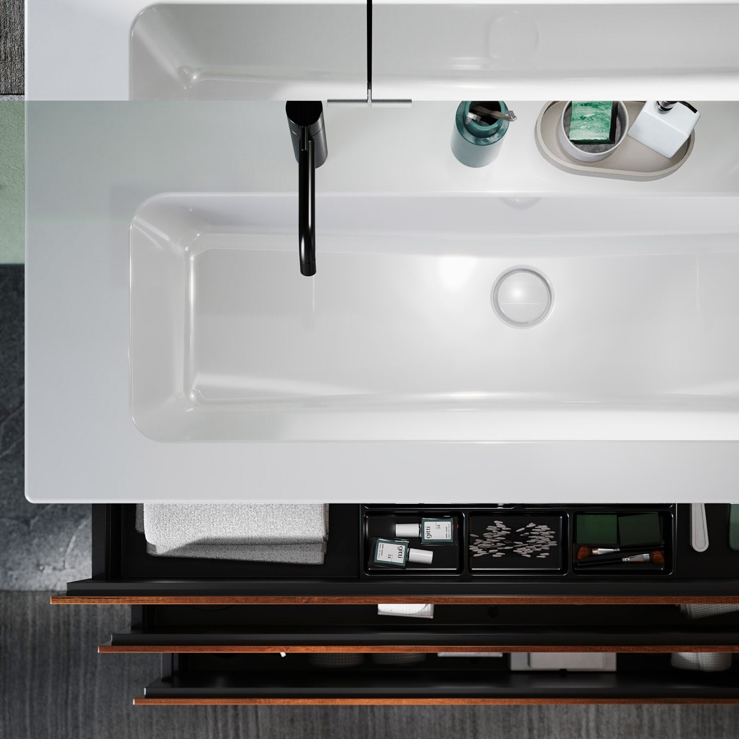- 1 Auszug oben H: 22 T: 35 cm, mit Siphonausschnitt und Inneneinteilung