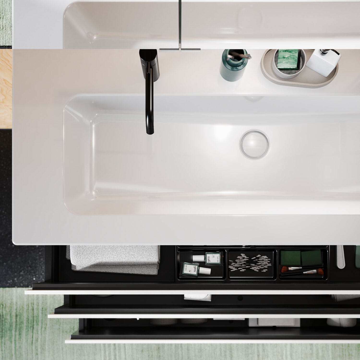 - 1 Auszug oben H: 22 T: 35 cm, mit Siphonausschnitt und Inneneinteilung