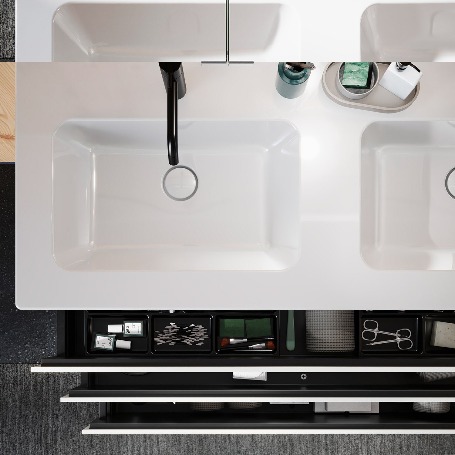 - 1 Auszug oben H: 22 T: 35 cm, mit 2 Siphonausschnitten und Inneneinteilungen