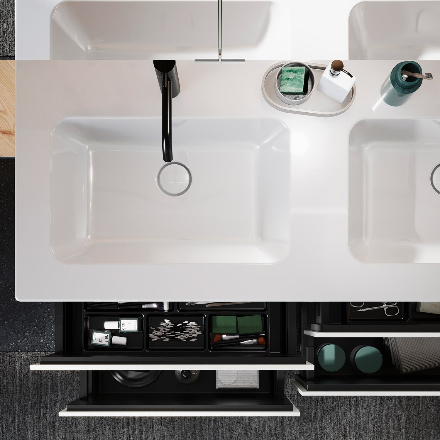 - 2 Auszüge oben H: 22 T: 35 cm, mit Siphonausschnitten und Inneneinteilungen