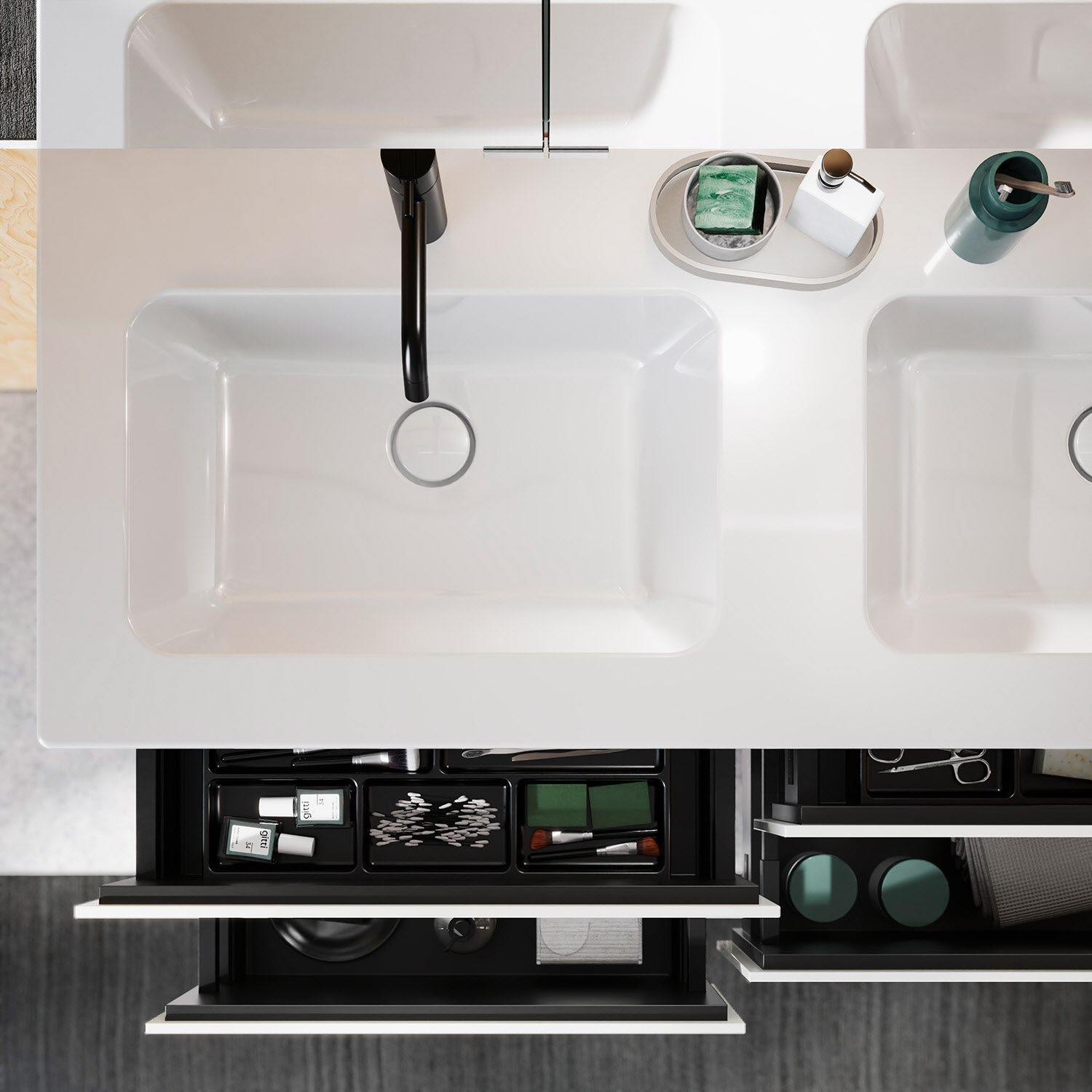 - 2 Auszüge oben H: 22 T: 35 cm, mit Siphonausschnitten und Inneneinteilungen