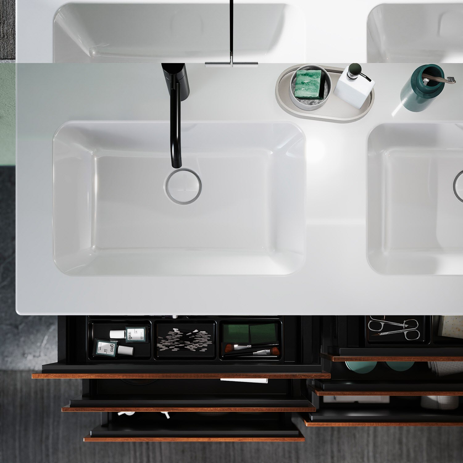 - 2 Auszüge oben H: 22 T: 35 cm, mit Siphonausschnitt und Inneneinteilungen