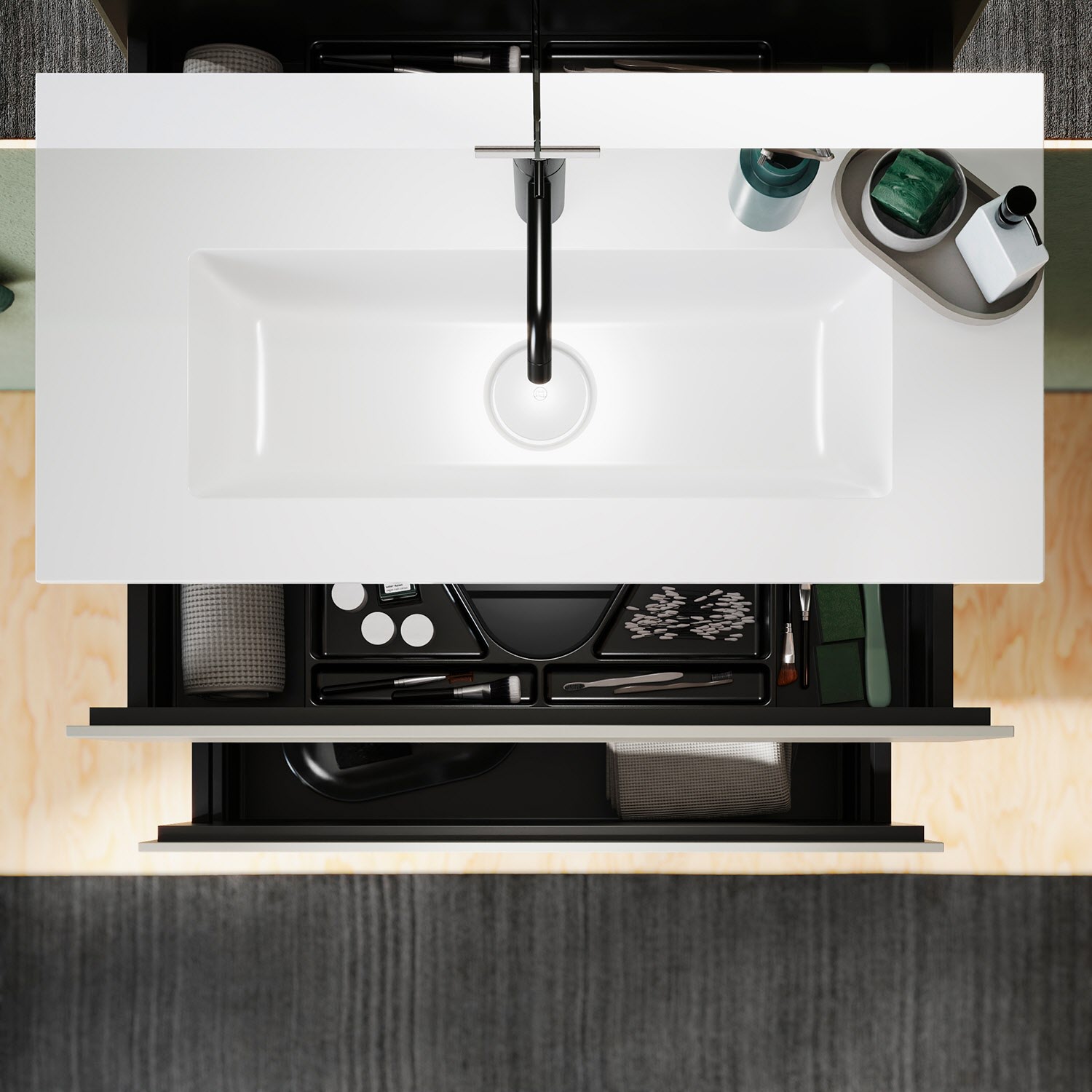 - 1 Auszug oben H: 22 T: 26 cm, mit Siphonausschnitt und Inneneinteilung