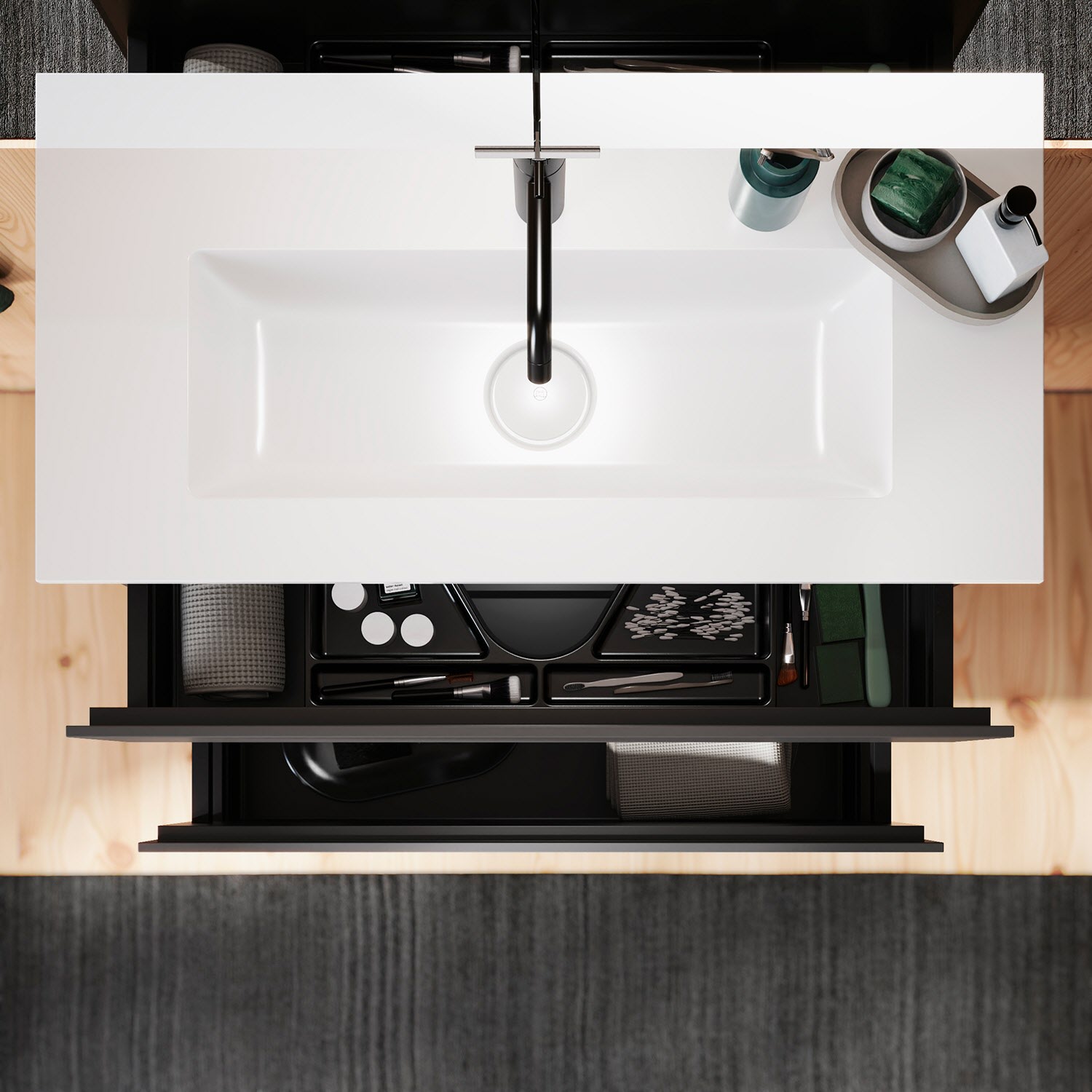 - 1 Auszug oben H: 22 T: 26 cm, mit Siphonausschnitt und Inneneinteilung