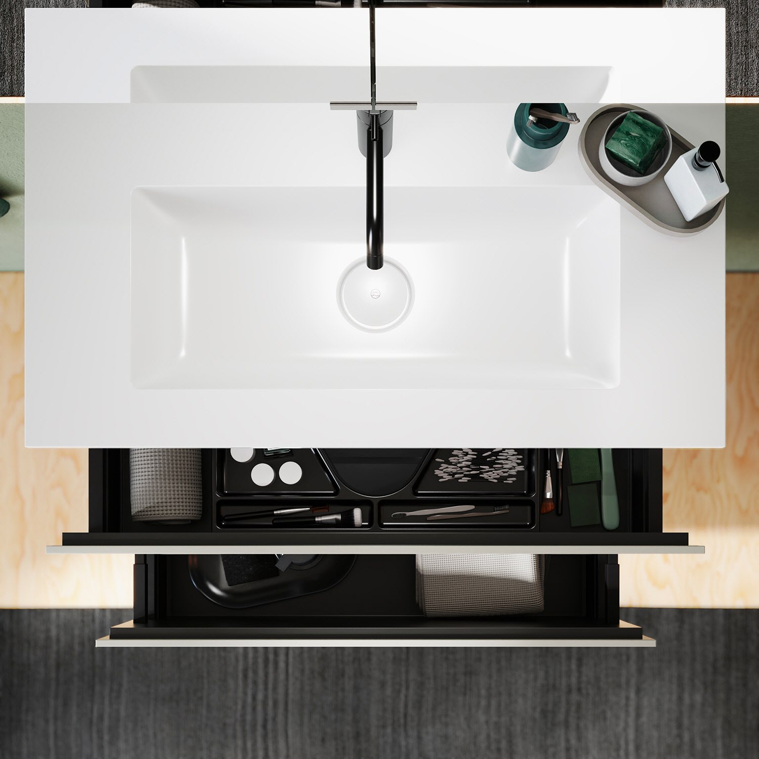 - 1 Auszug oben H: 22 T: 26 cm, mit Siphonausschnitt und Inneneinteilung