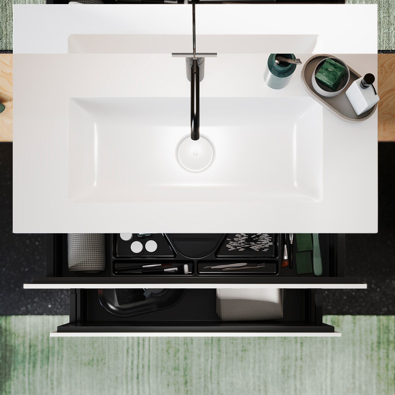 - 1 Auszug oben H: 22 T: 26 cm, mit Siphonausschnitt und Inneneinteilung