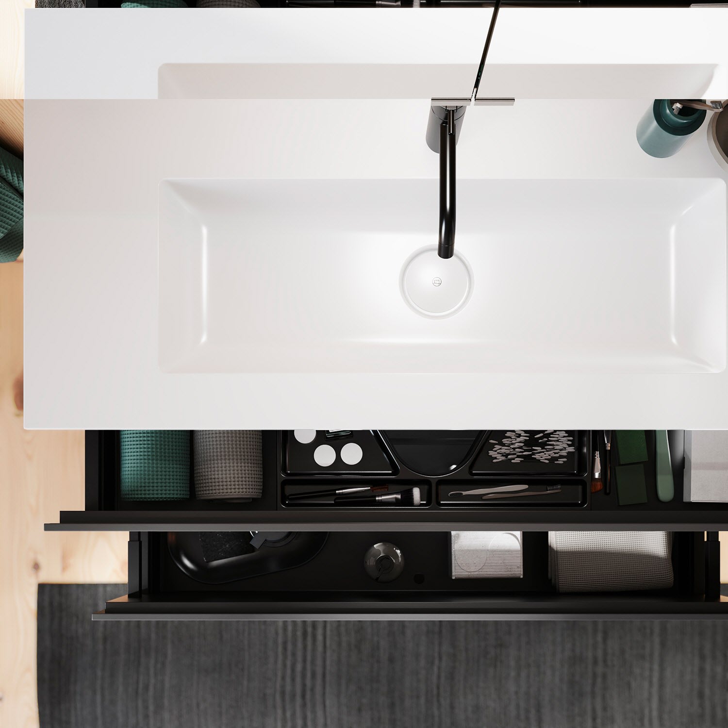 - 1 Auszug oben H: 22 T: 26 cm, mit Siphonausschnitt und Inneneinteilung
