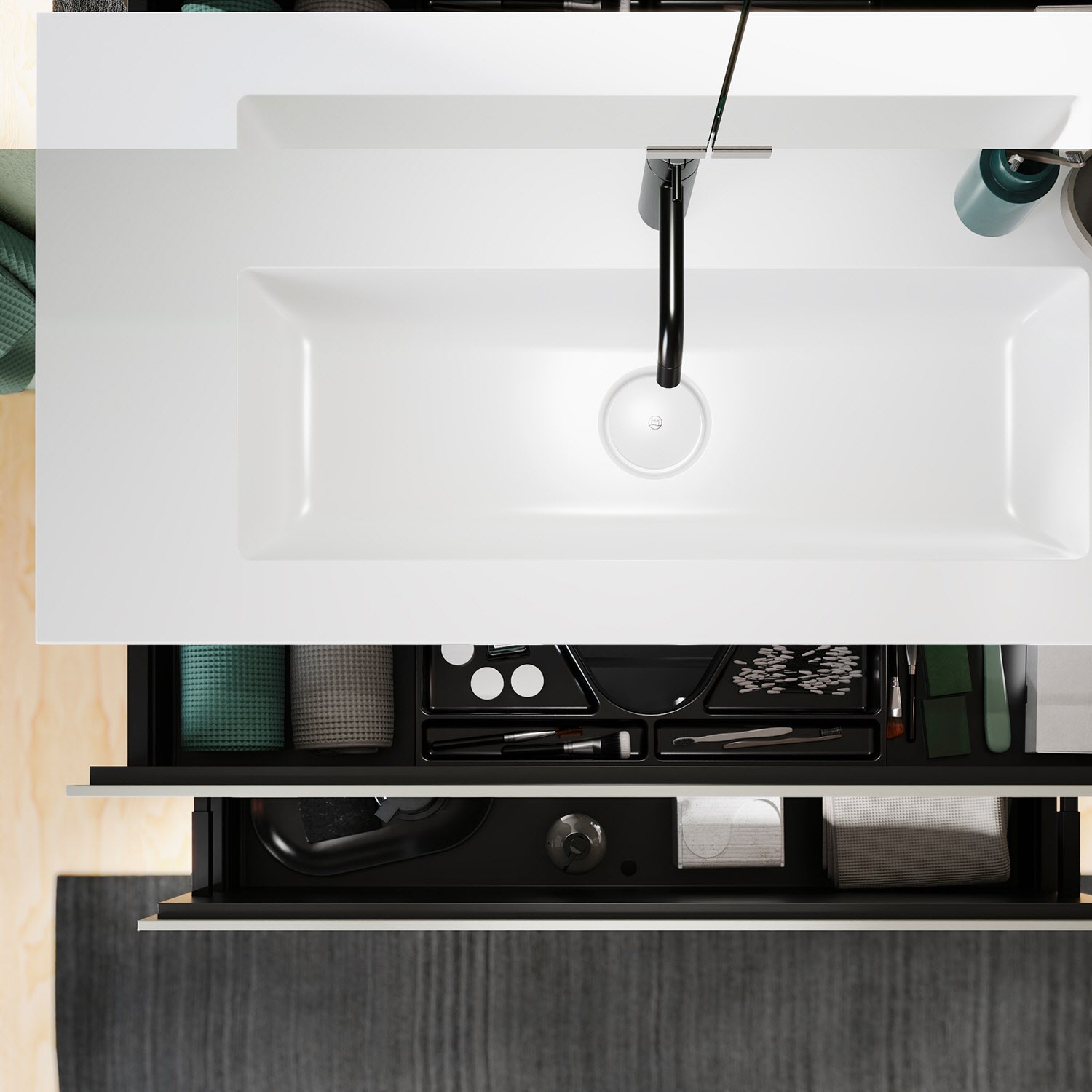 - 1 Auszug oben H: 22 T: 26 cm, mit Siphonausschnitt und Inneneinteilung