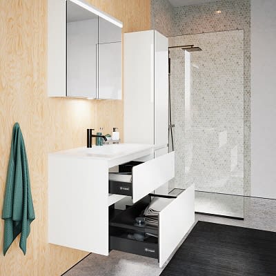 - Vollauszüge mit geräuscharmem Selbsteinzugsmechanismus und Anschlagdämpfung (Silent System)