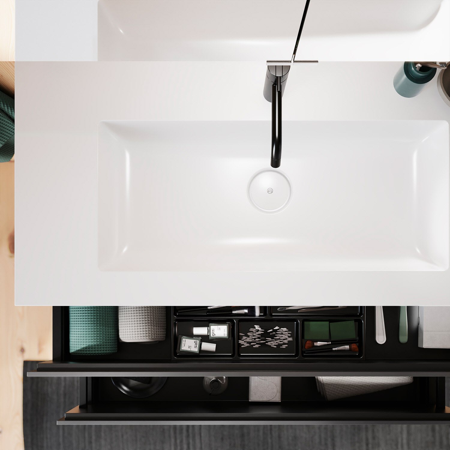 - 1 Auszug oben H: 22 T: 35 cm, mit Siphonausschnitt und Inneneinteilung