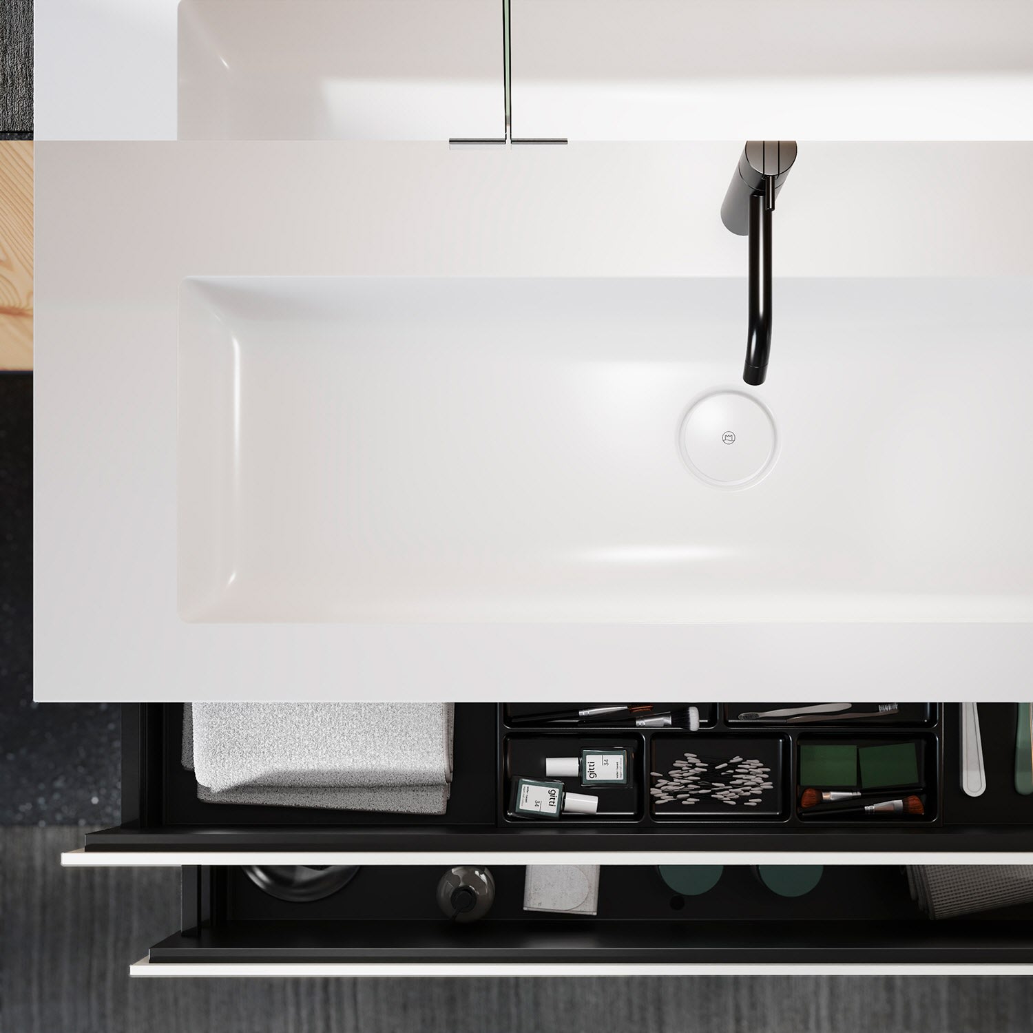 - 1 Auszug oben H: 22 T: 35 cm, mit Siphonausschnitt und Inneneinteilung