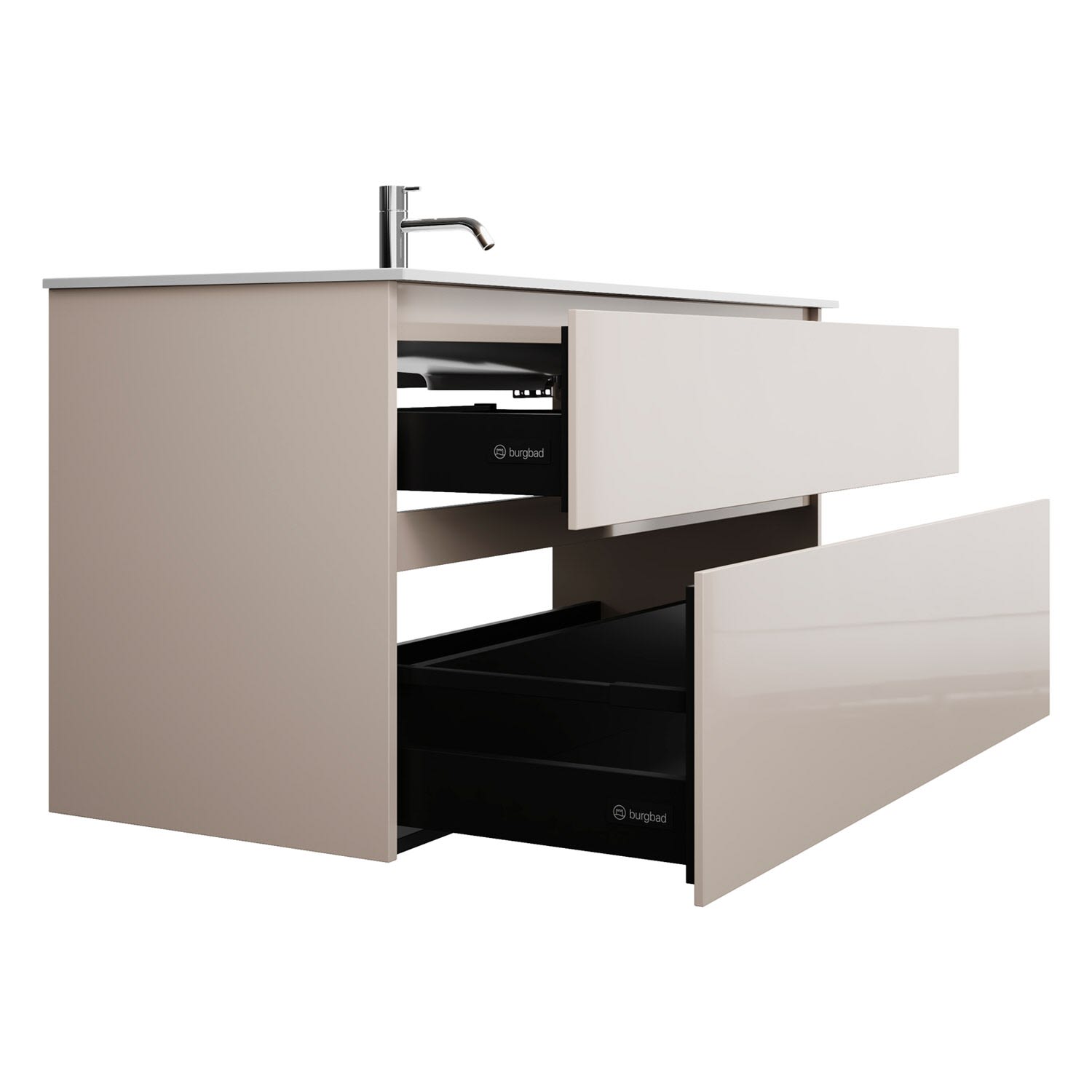 - Vollauszüge mit geräuscharmem Selbsteinzugsmechanismus und Anschlagdämpfung (Silent System)
