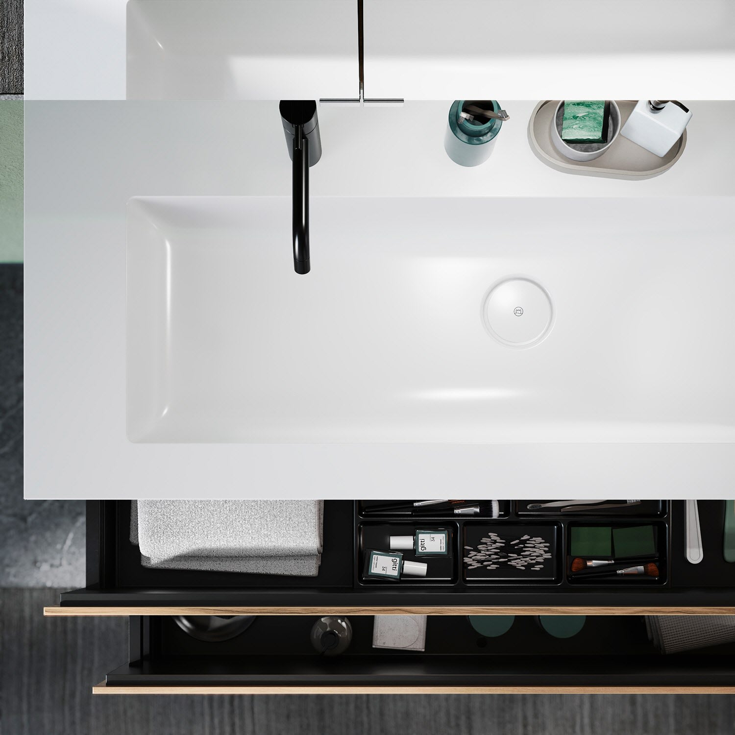 - 1 Auszug oben H: 22 T: 35 cm, mit Siphonausschnitt und Inneneinteilung