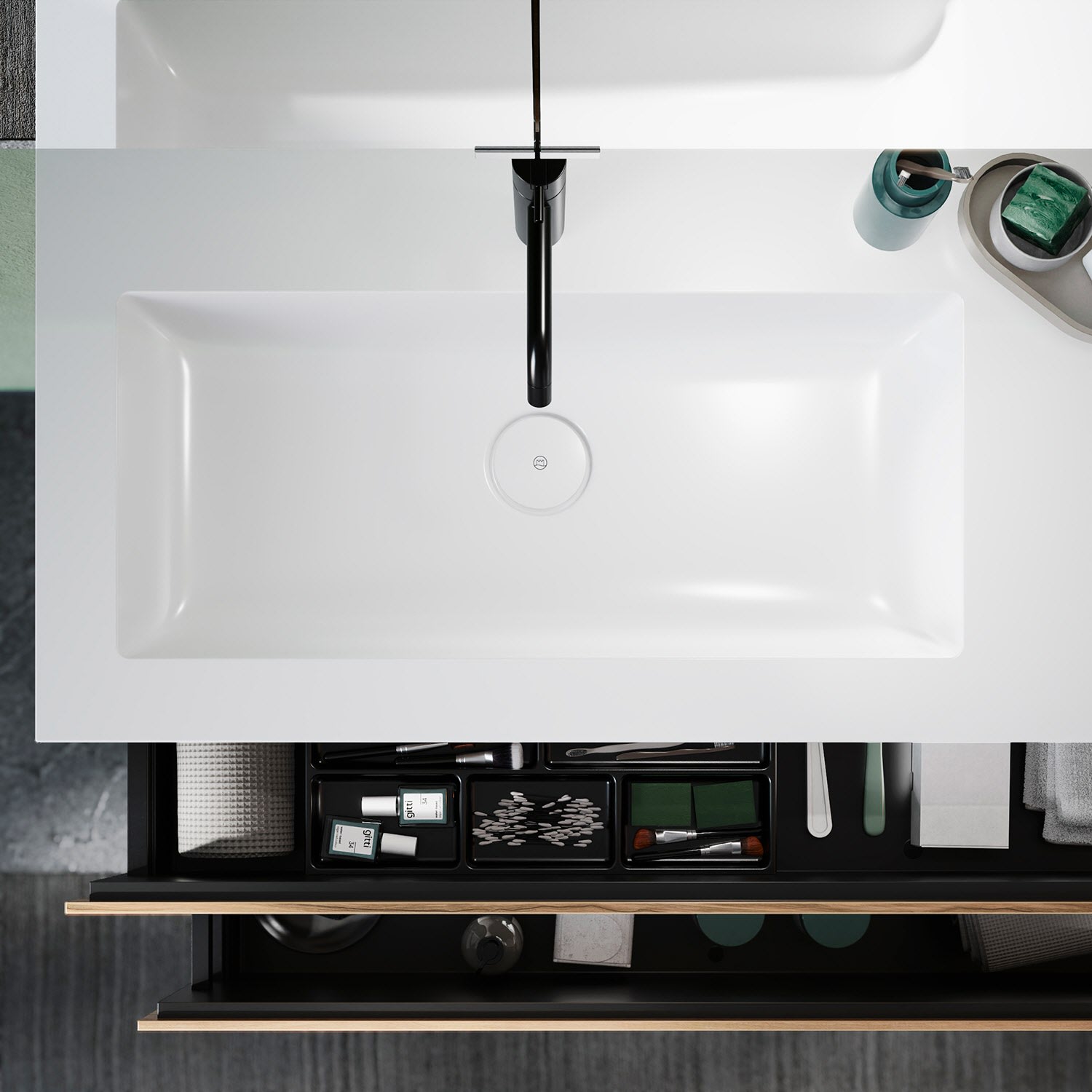 - 1 Auszug oben H: 22 T: 35 cm, mit Siphonausschnitt und Inneneinteilung