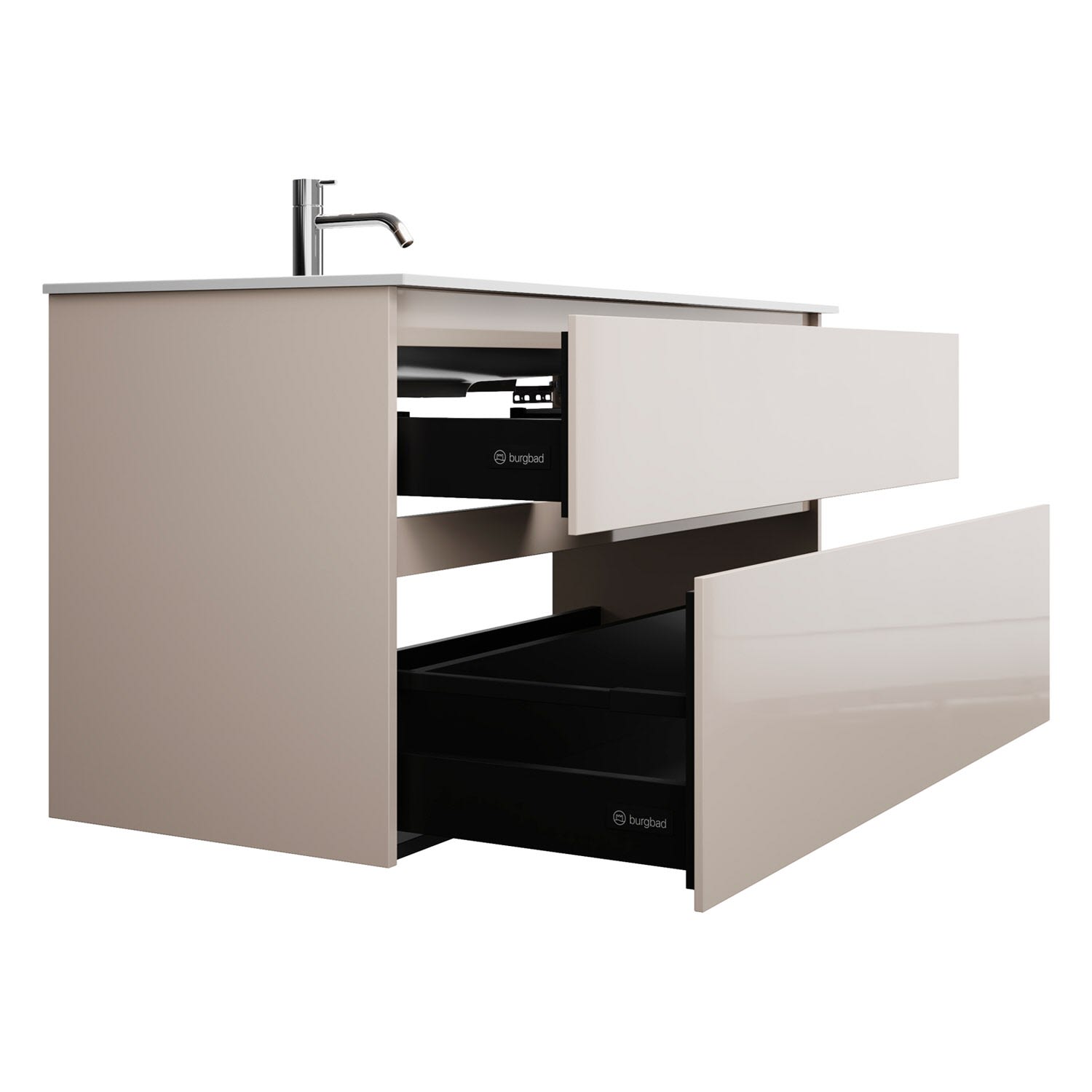 - Vollauszüge mit geräuscharmem Selbsteinzugsmechanismus und Anschlagdämpfung (Silent System)