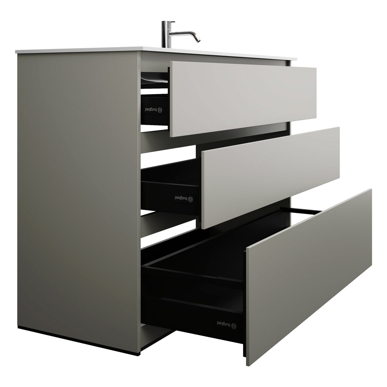 - Vollauszüge mit geräuscharmem Selbsteinzugsmechanismus und Anschlagdämpfung (Silent System)