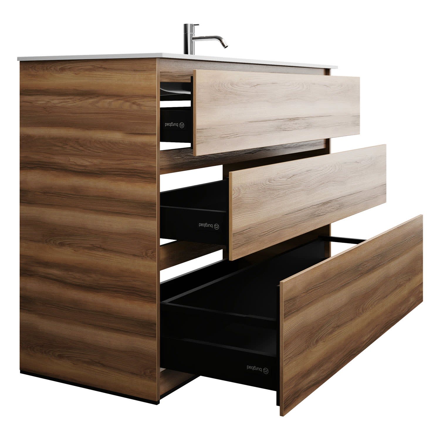 - Vollauszüge mit geräuscharmem Selbsteinzugsmechanismus und Anschlagdämpfung (Silent System)