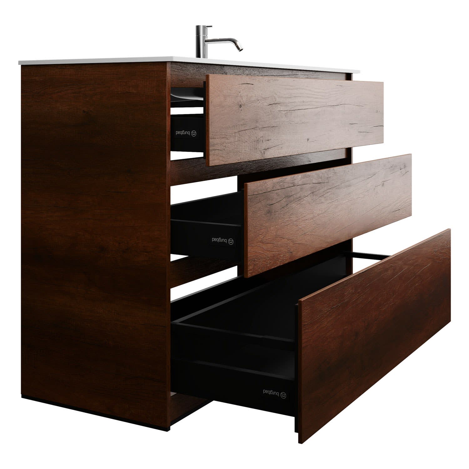 - Vollauszüge mit geräuscharmem Selbsteinzugsmechanismus und Anschlagdämpfung (Silent System)